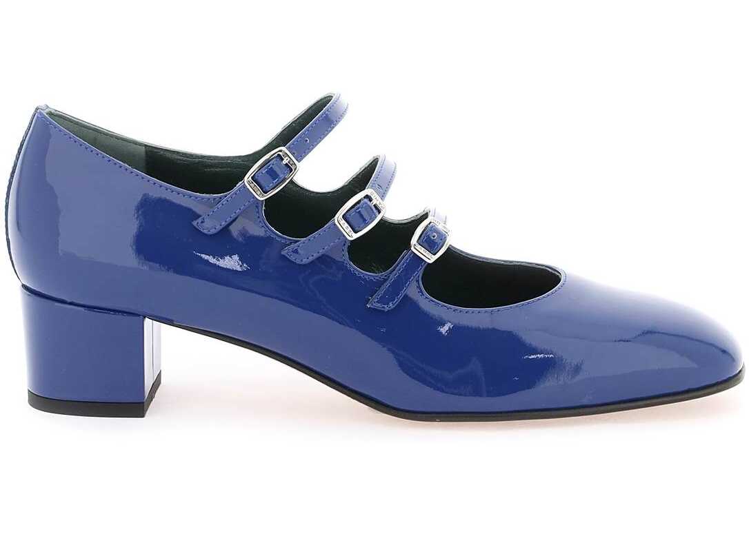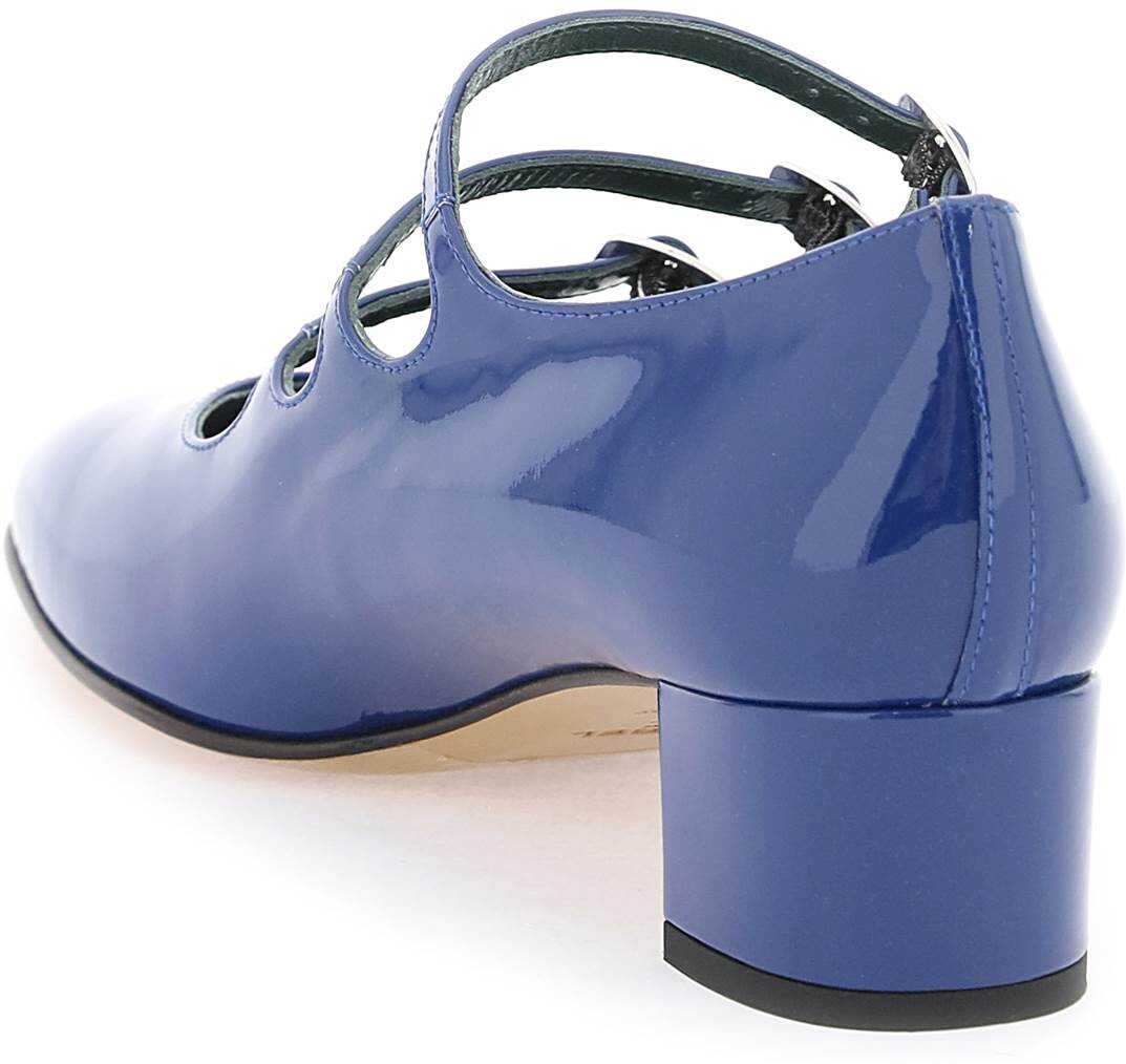 Patent leather Mary Jane by Carel featuring the three adjustable straps. Wide heel, squared toe, leather footbed and leather sole.