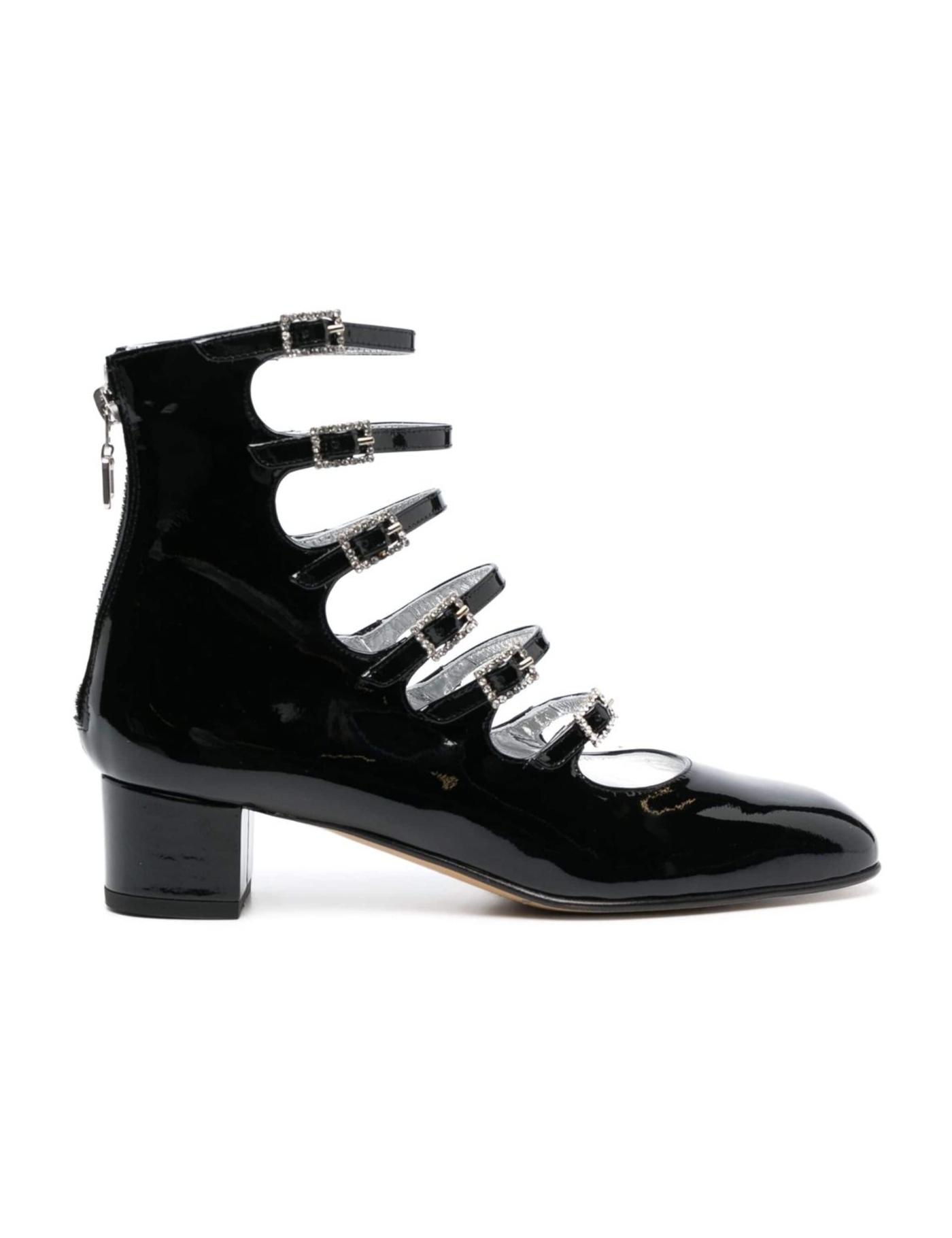 Carel Paris reimagines classic Mary Janes with a unique multi-strap silhouette. A rear zip allows the shoes to be put on effortlessly whilst a patent leather finish lends a polished look.