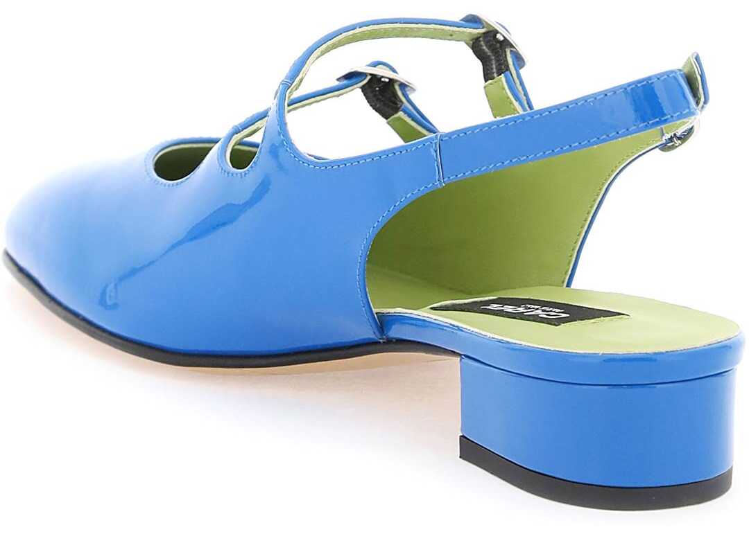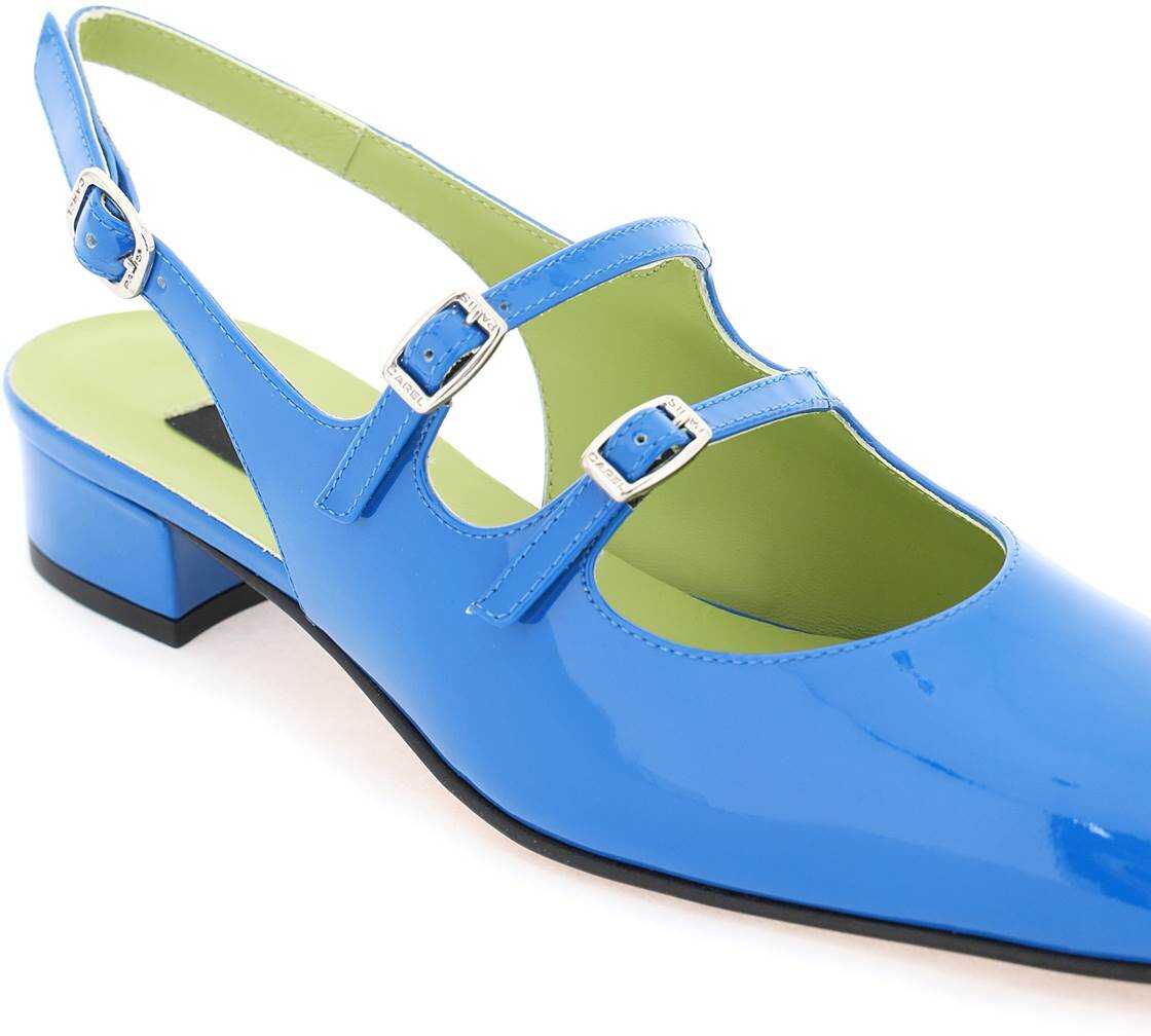 Mary Jane slingback by Carel made of patent leather with adjustable straps. Leather footbed and sole.