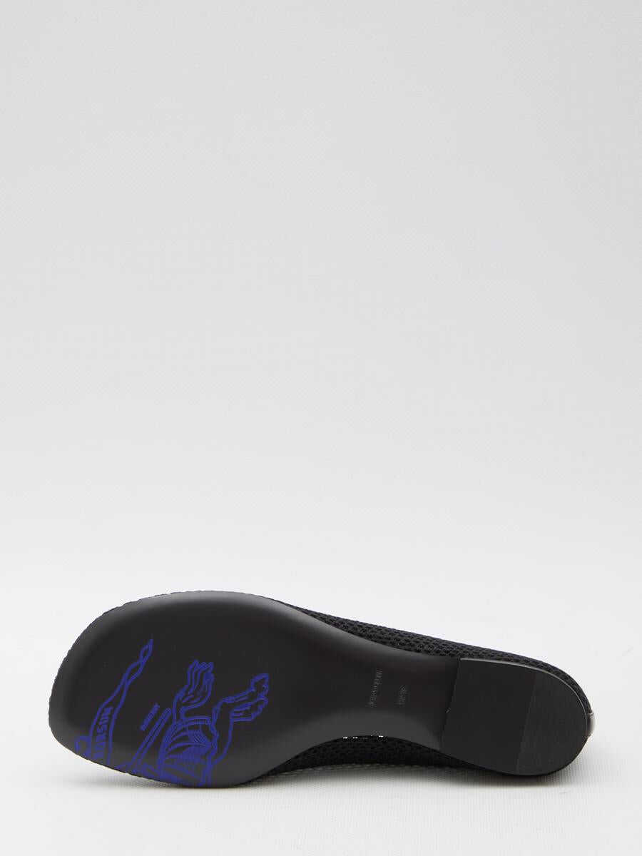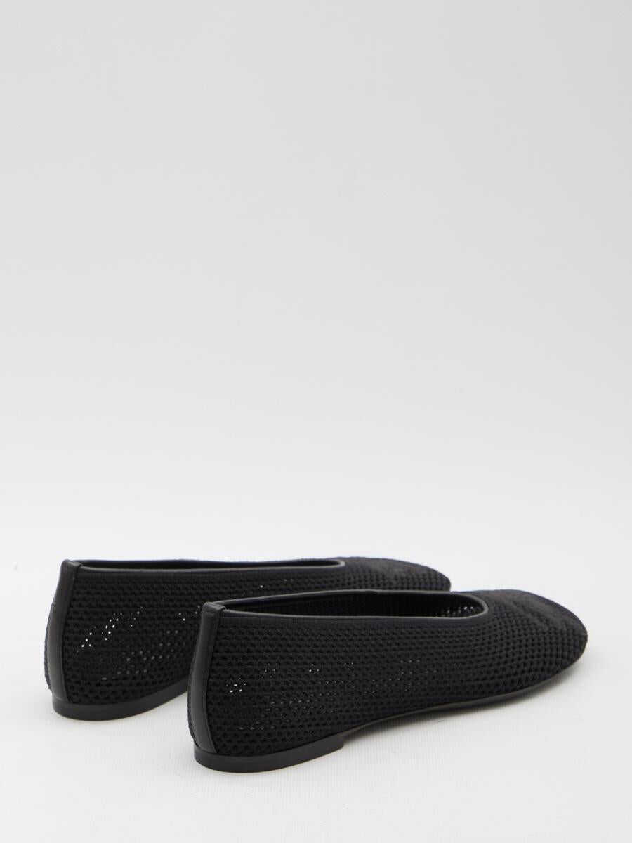 Black mesh fabric ballerinas with smooth nappa trims and Equestrian Knight Design embroidery. They feature round toe, elastic at the back, quilted leather insole and leather sole.