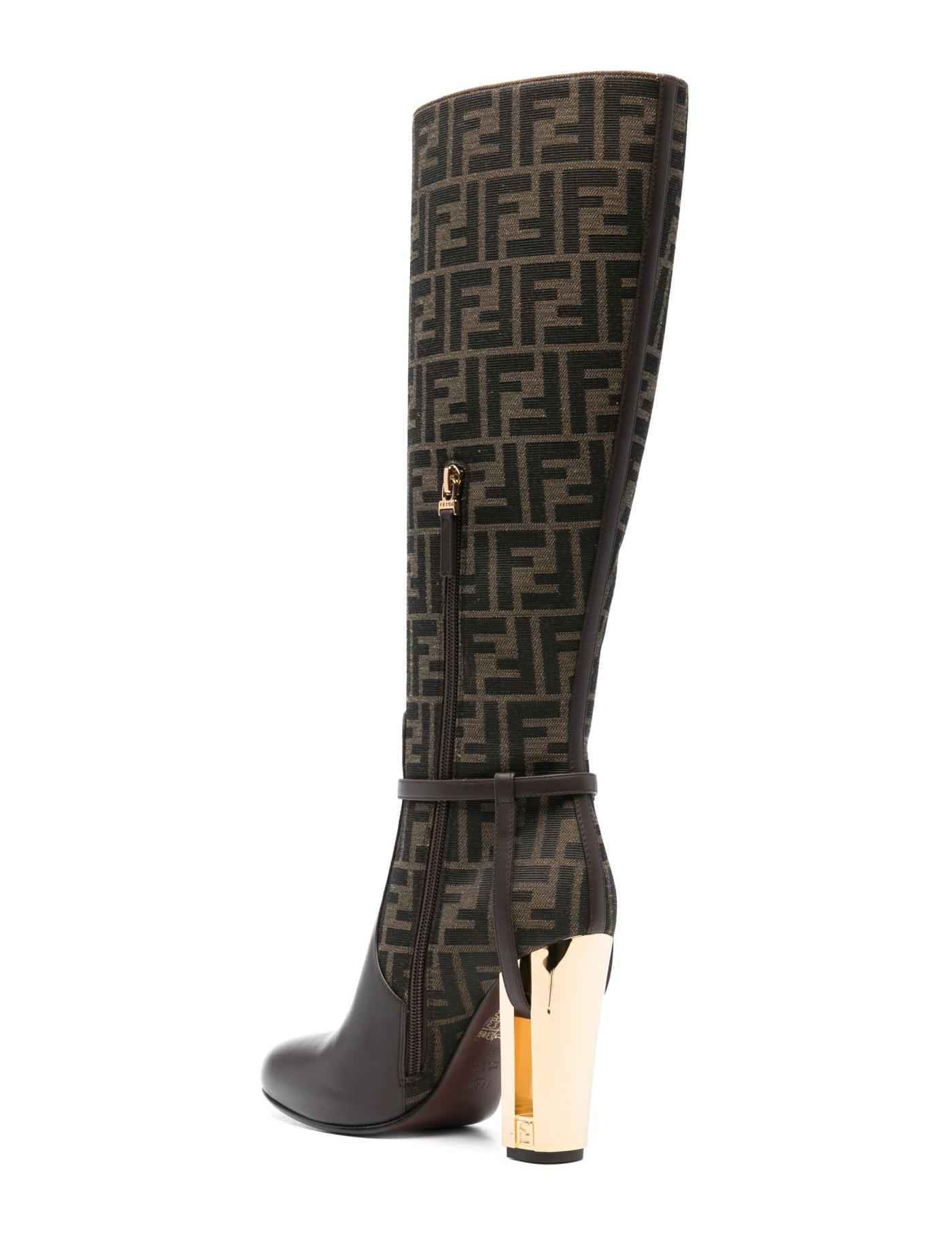 Characterised by a contrast between leather and monogram jacquard canvas, the Delfina boots by Fendi are set on a gold-tone high block heel accentuated with a cut-out at the centre.