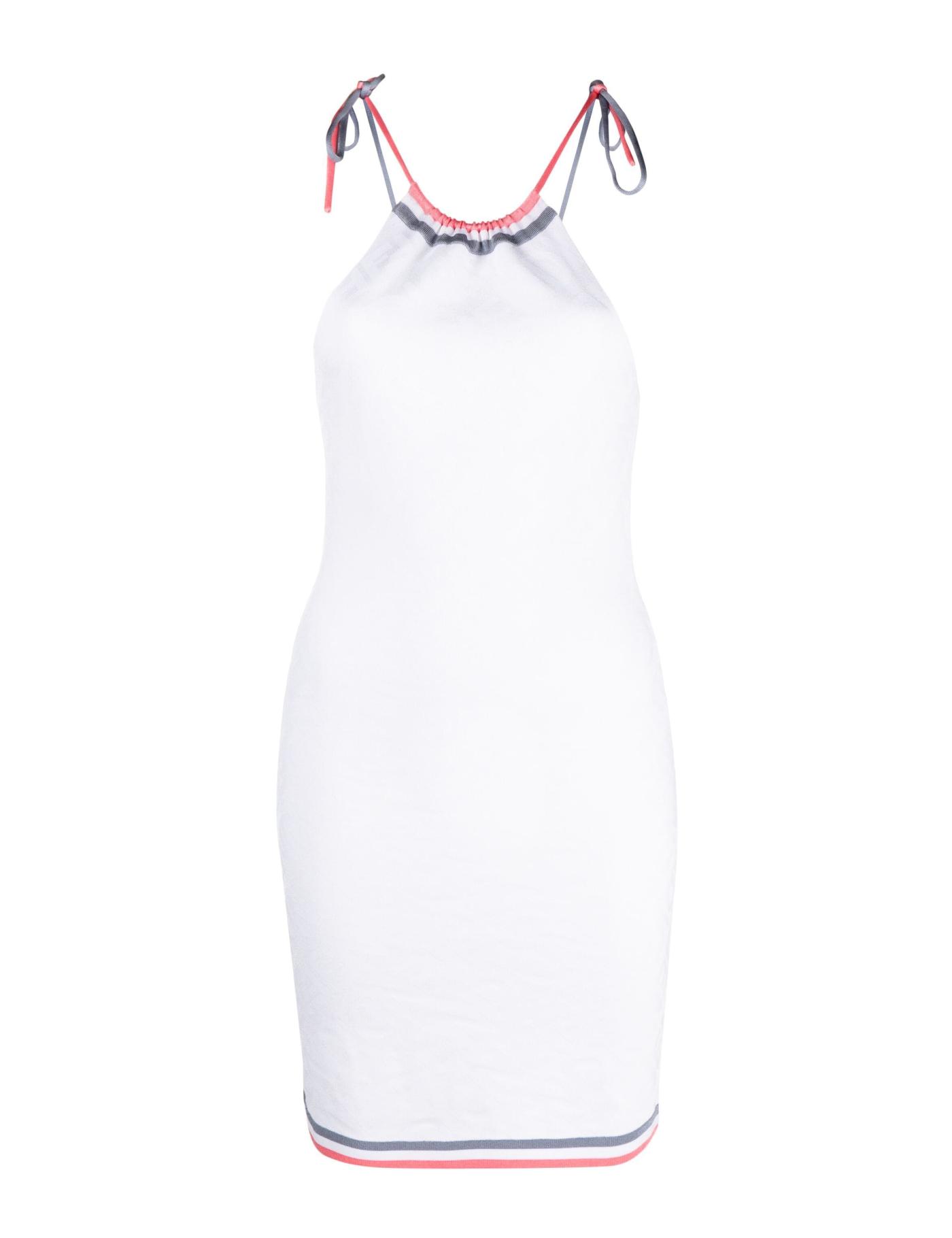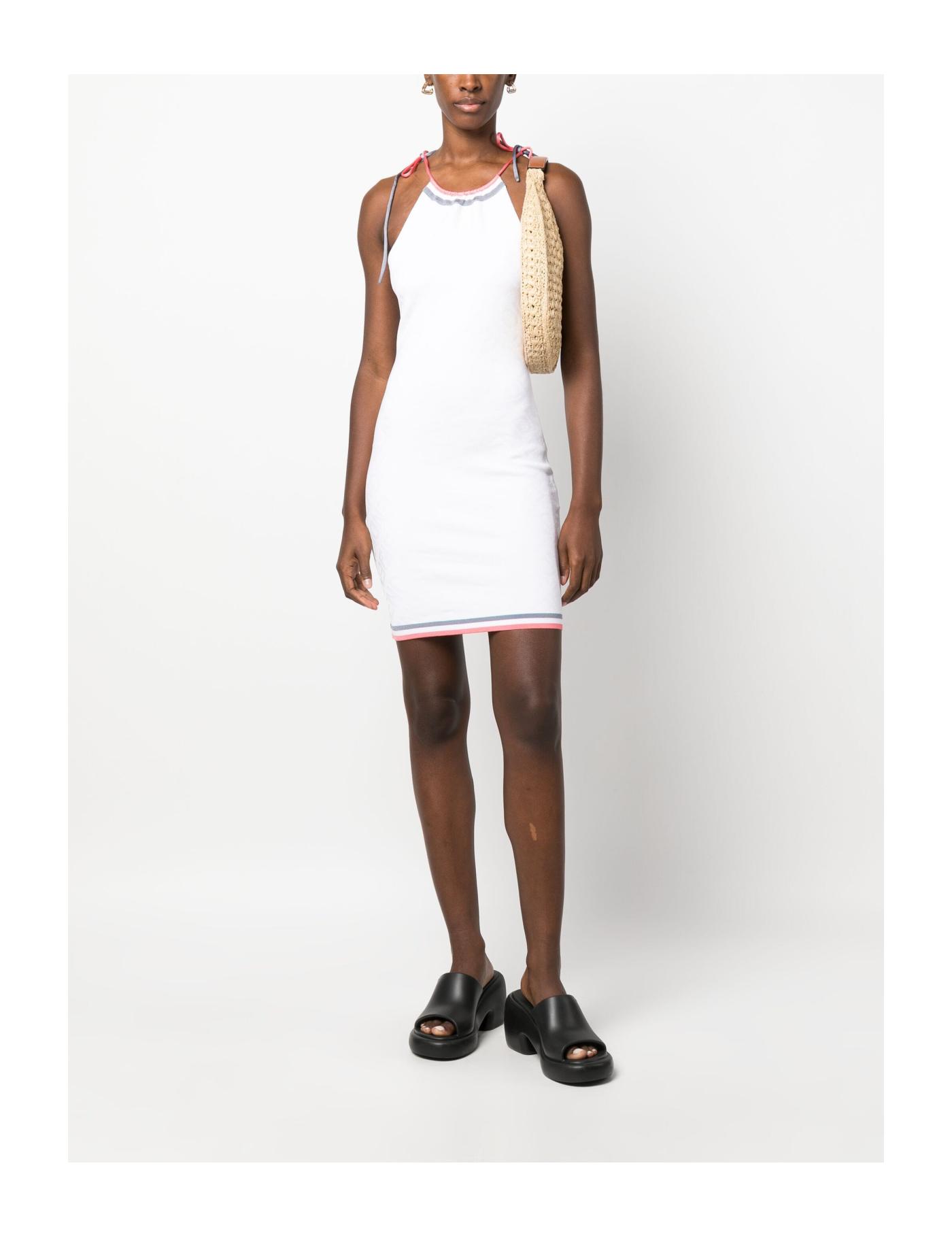 Fendi puts its stamp on this white halterneck dress. It’s spun with branded intarsia lettering and framed with contrasting stripes at the hem and neck.