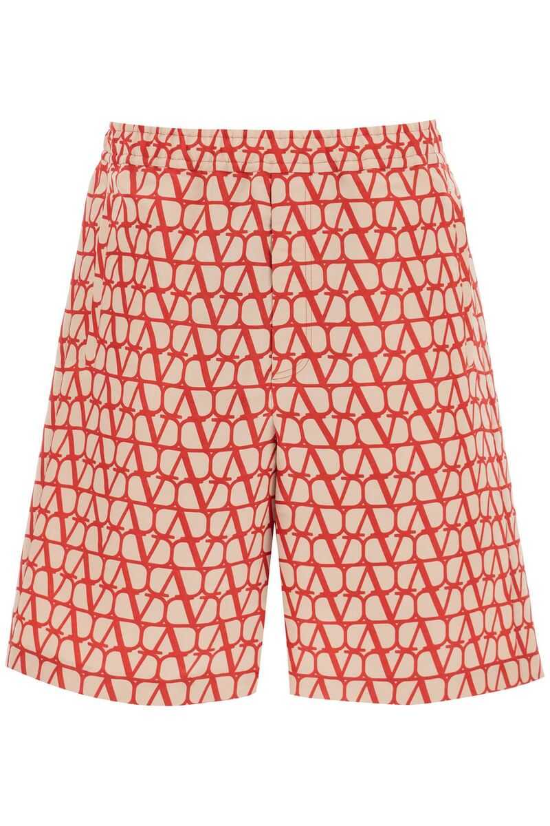 Toile Iconographe Bermuda shorts featuring chocolate brown, black, silk, VLogo Signature, all-over logo print, elasticated waistband, two side slit pockets, two rear welt pockets, knee-length and straight hem.