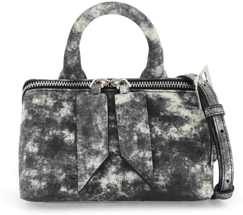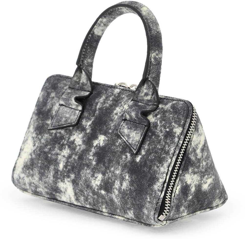 The Attico's mini Friday bag is made of printed denim-effect leather and features a triangular structure. It has a double zip closure with a Mexican-style zipper pull, a single handle, and a leather-lined interior with a small pocket and protective triangular feet at the base. The adjustable and removable shoulder strap can also be worn as a belt, and the metallic accessories have a silver finish.
