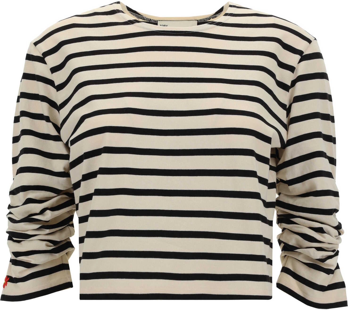 Cotton Top by Tory Burch, cropped style, short sleeves with ruffled detail, two-tone striped pattern, regular fit.