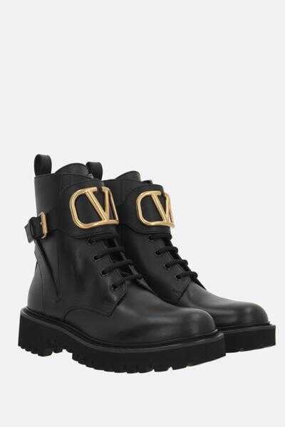 Valentino Garavani's combat boots crafted in black smooth leather. Featuring lace-up closure, a round-toe silhouette, leather lining and lug rubber sole. The design is completed by an adjustable ankle strap with the iconic antique gold-tone metal VLogo Signature detailing.