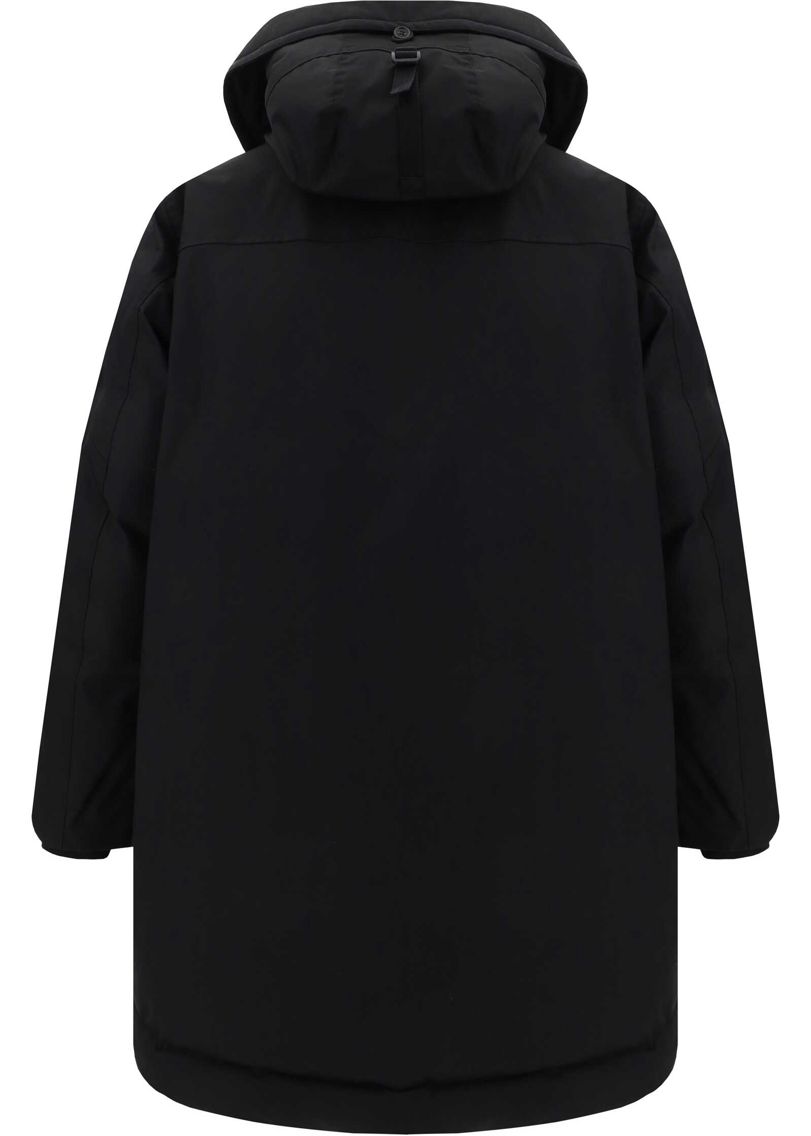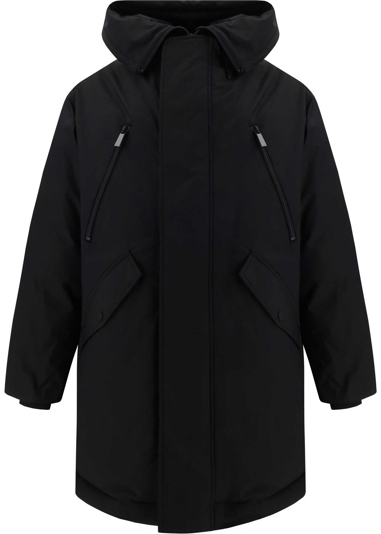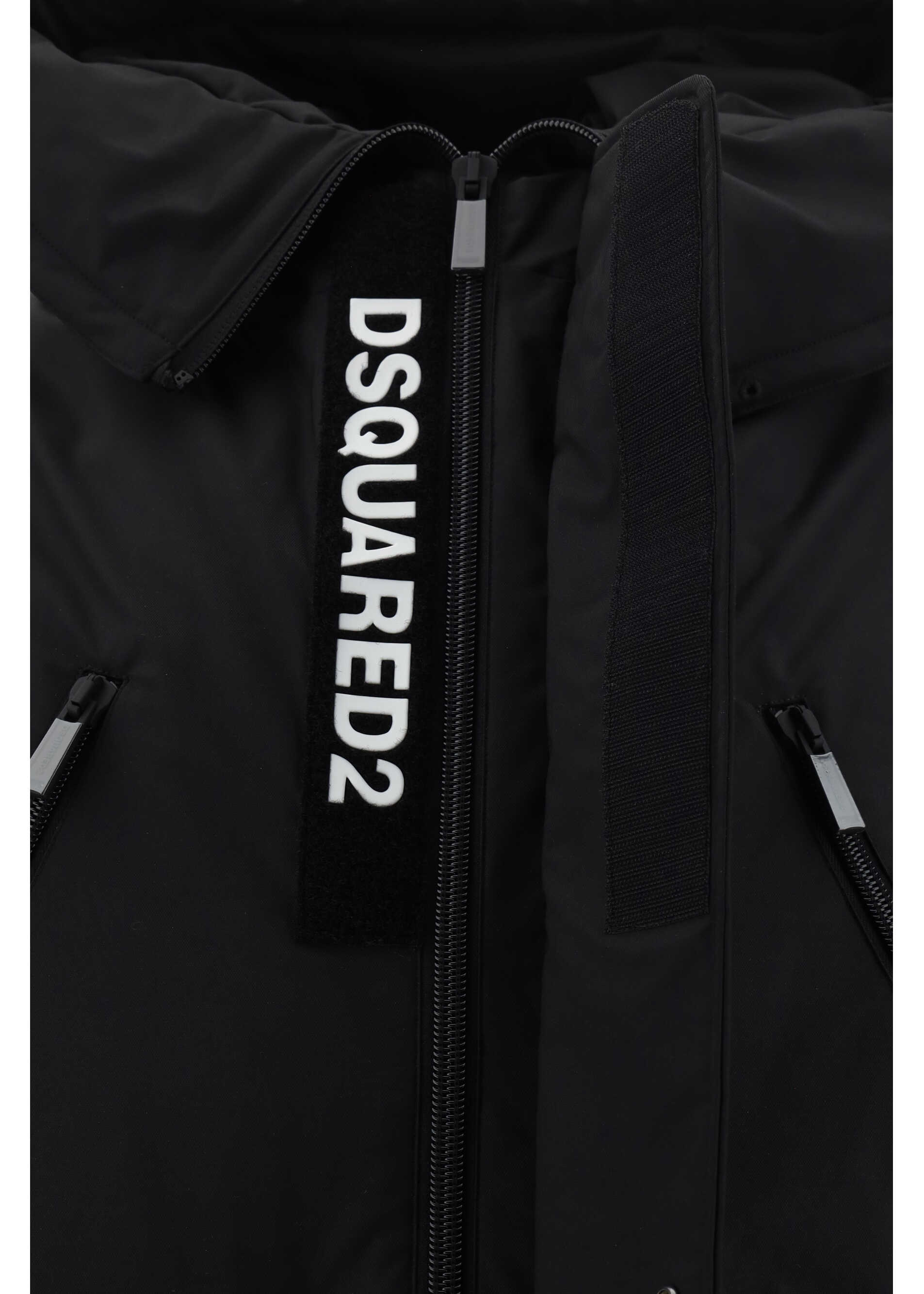 Parka Jacket by Dsquared2, high colo model with hood, front closure by double-slider zipper and snap button flap, two zippered welt pockets on front, two slit pockets with flap on front panel, elastic ribbed cuffs, monochrome pattern, all-over padded design, oversize fit.
