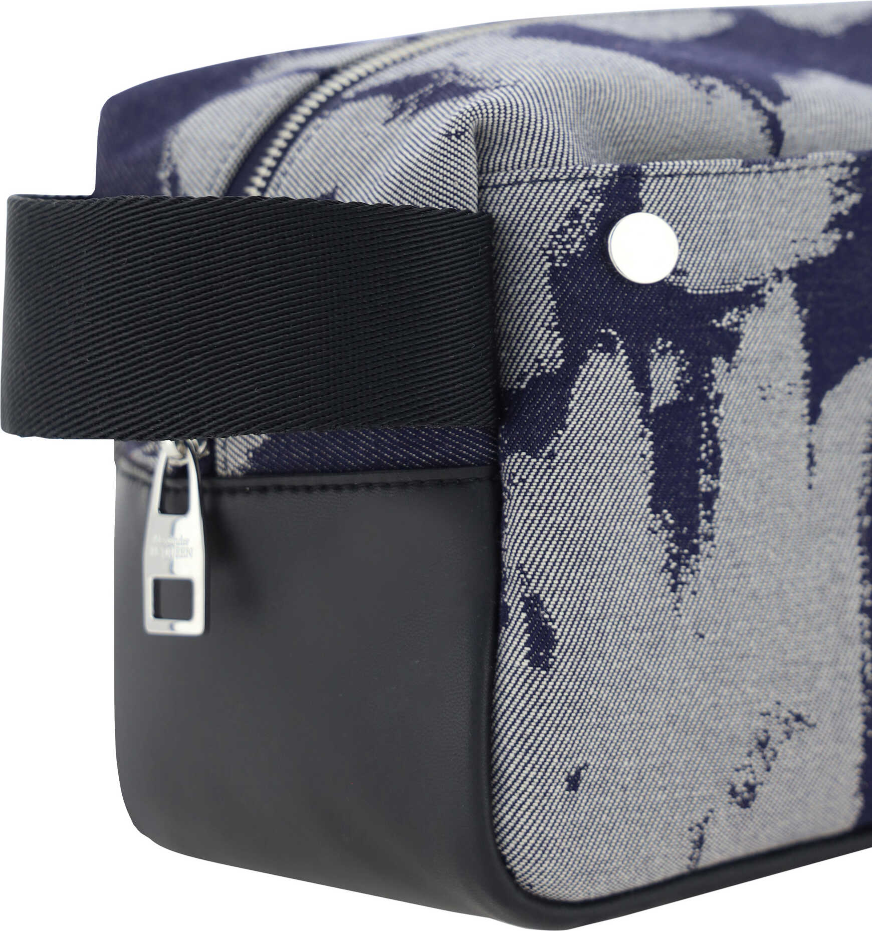 Cotton Beauty Case by Alexander McQueen, top closure by lap zipper, iconic all-over repeated Graffiti pattern, leather pull on side panel, slit pocket on front panel.