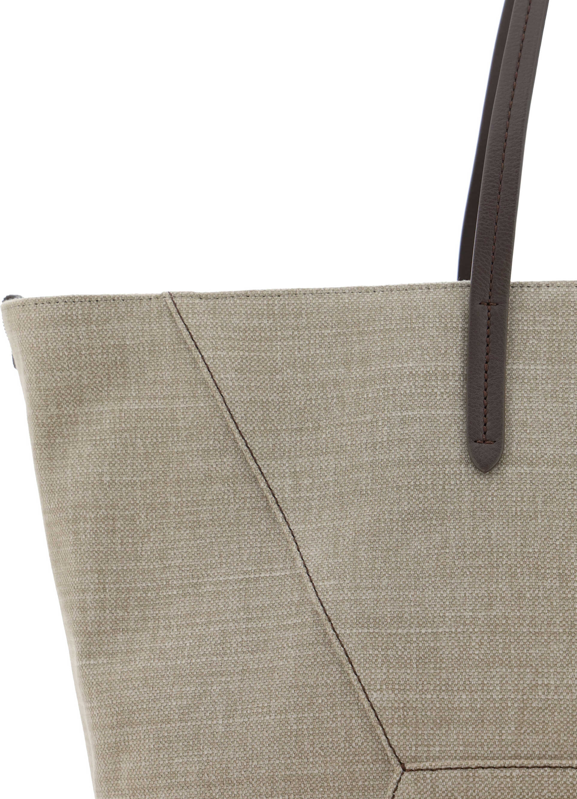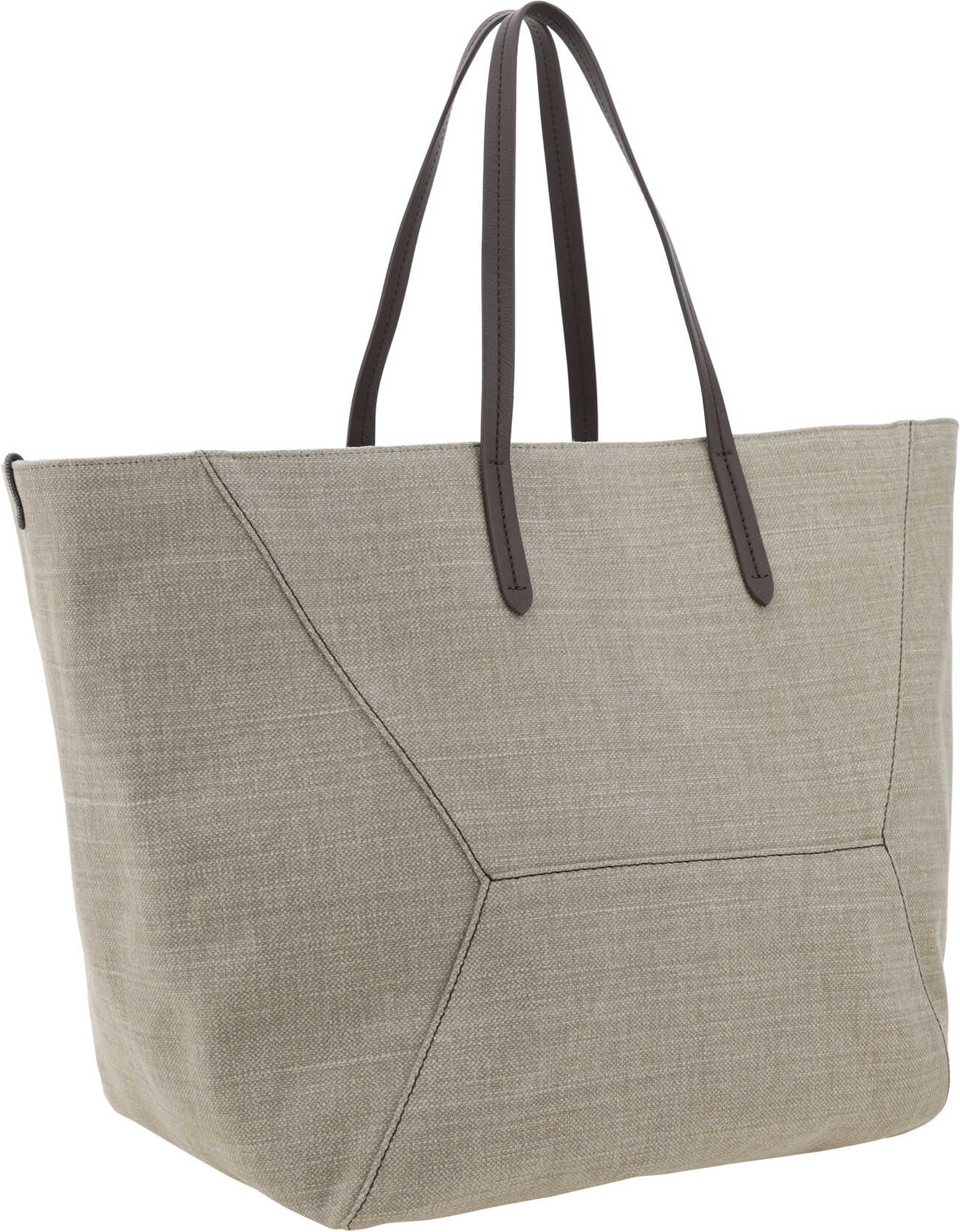 Cotton Linen Blend Trapeze Shoulder Bag by Brunello Cucinelli, contrasting leather trim and handles, interior magnetic button closure, interior zippered welt pocket, contrasting and embossed stitching.