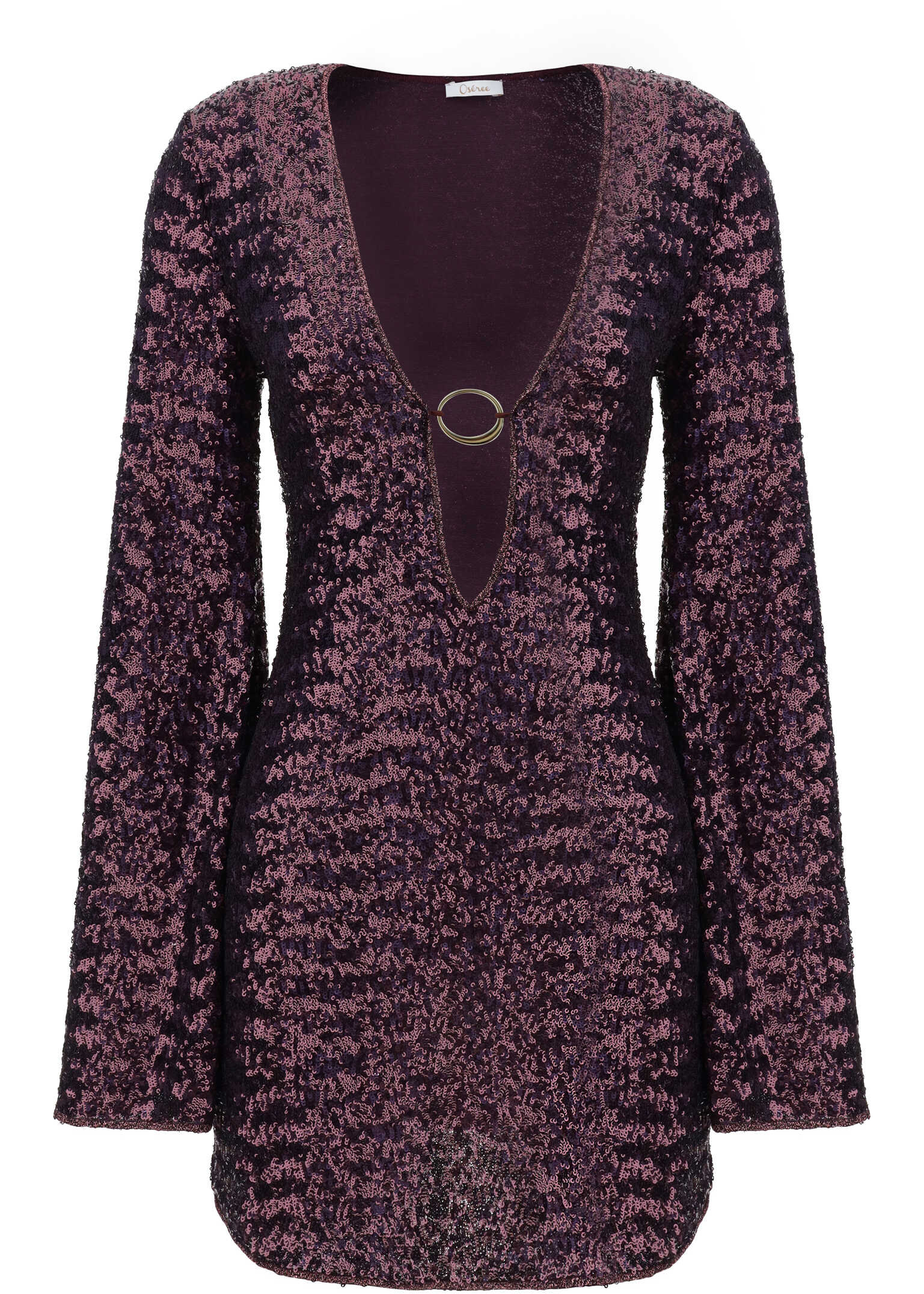 Caftan Dress by Oséree, mini model, wide long sleeves, deep V-neck on front embellished with circular metal plaque, all-over sequin design, regular fit, monochrome pattern.