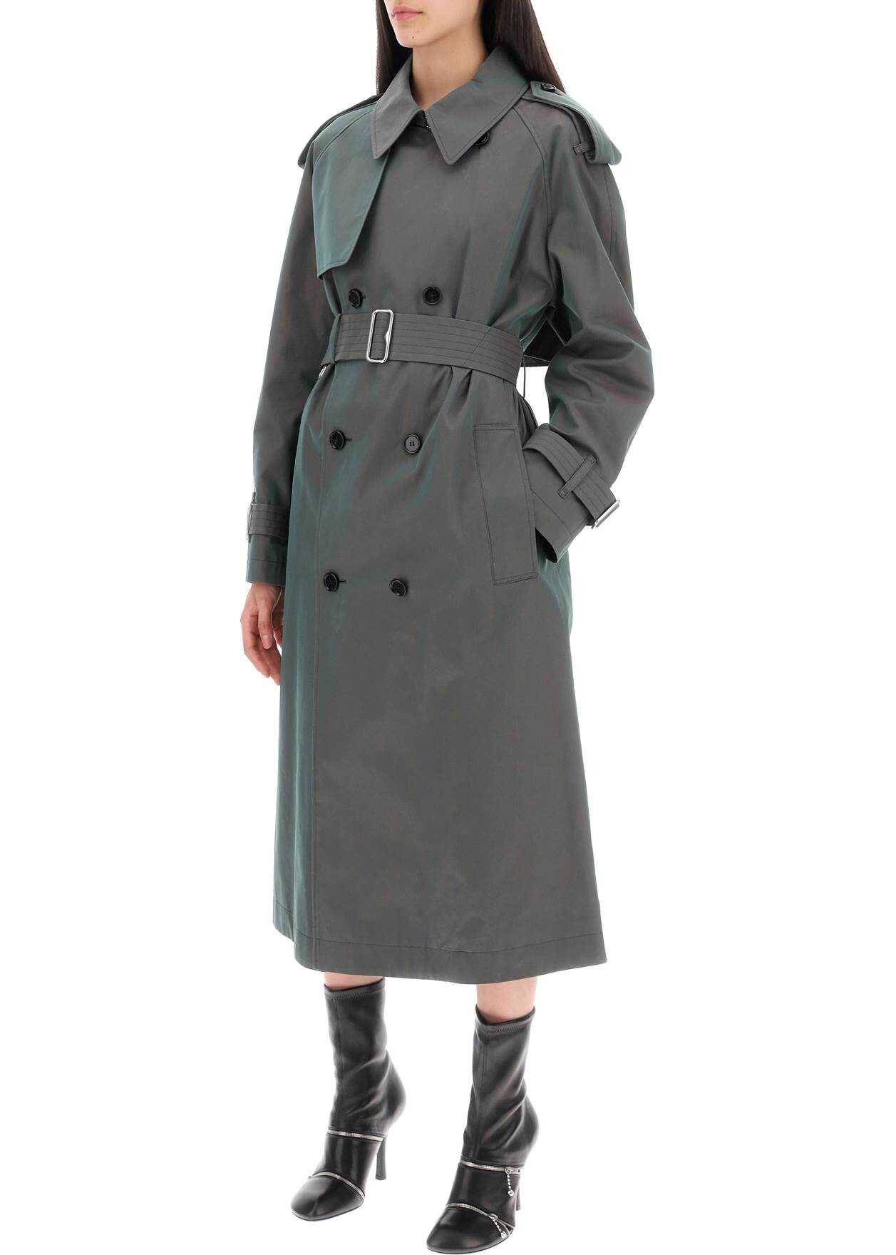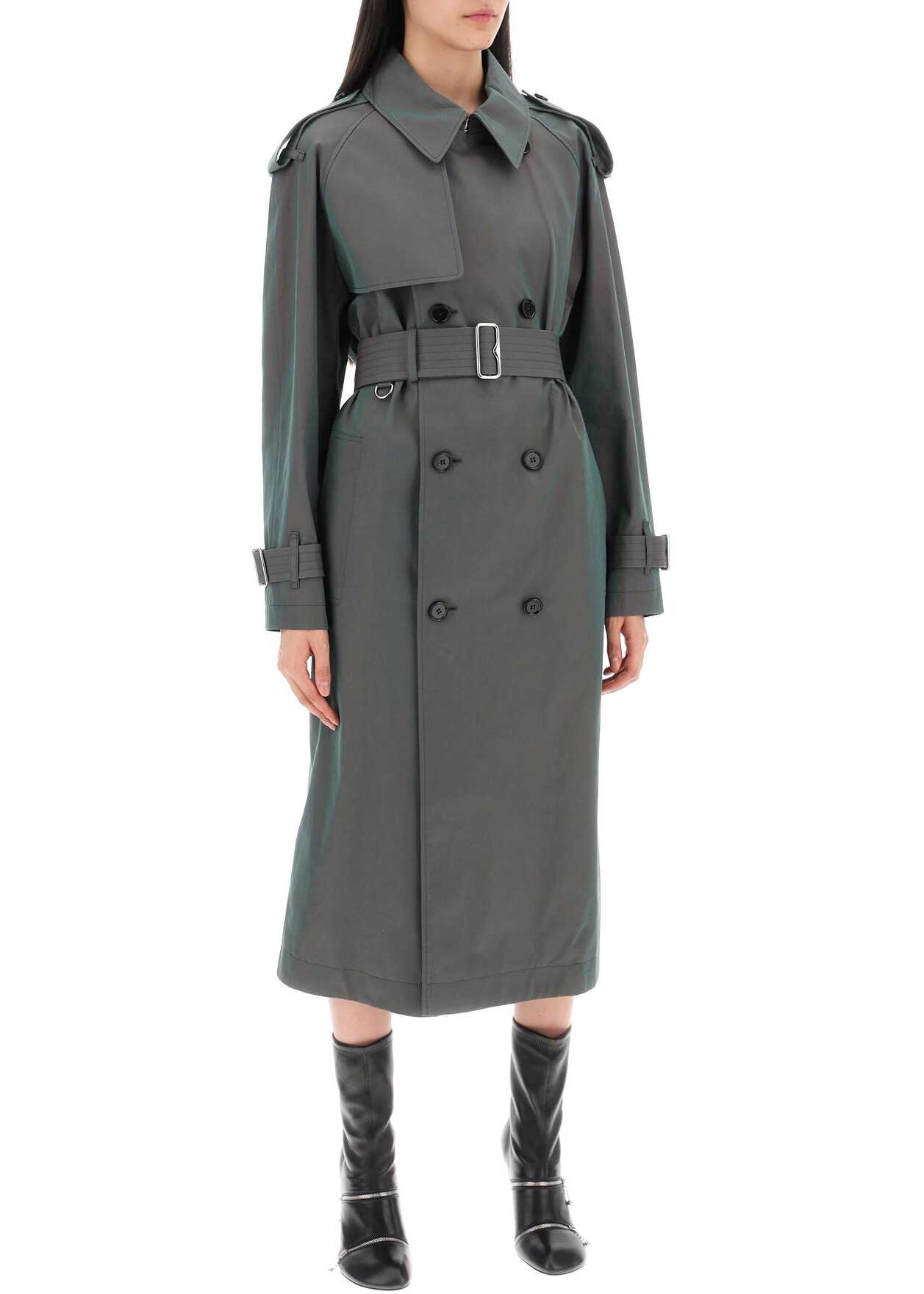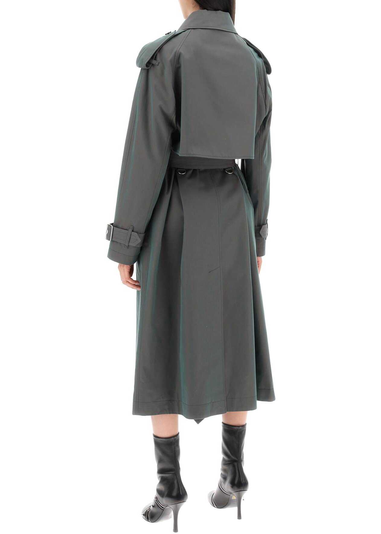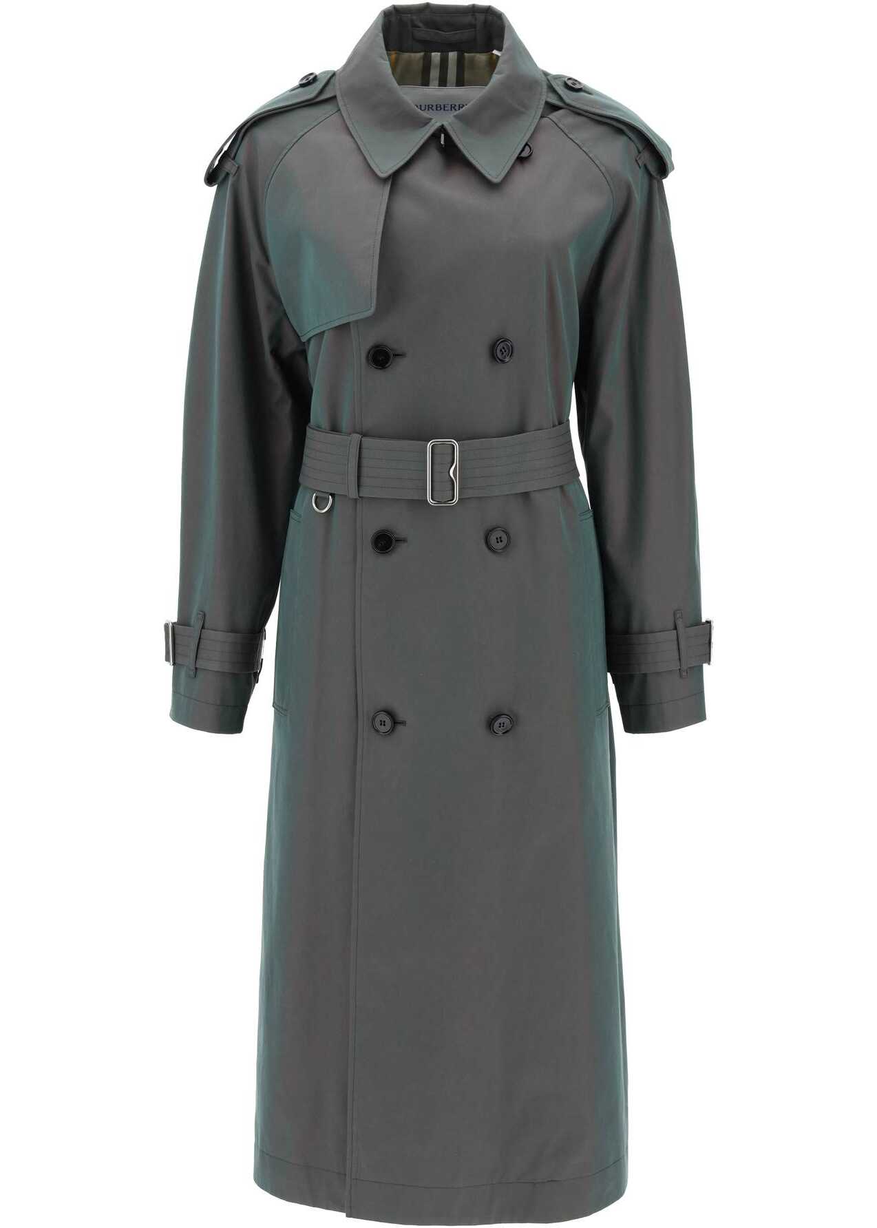 The unmistakable Burberry heritage is here translated into a long double-breasted trench coat that gives off iridescent reflections. Made of green cotton gabardine with a regular fit, this model features a classic double-breasted button closure and a practical sliding belt, as well as a series of traditional details such as raglan sleeves with epaulettes, wrist straps, a hook under the collar, windproof flaps on the chest and back, and a tartan lining. The two