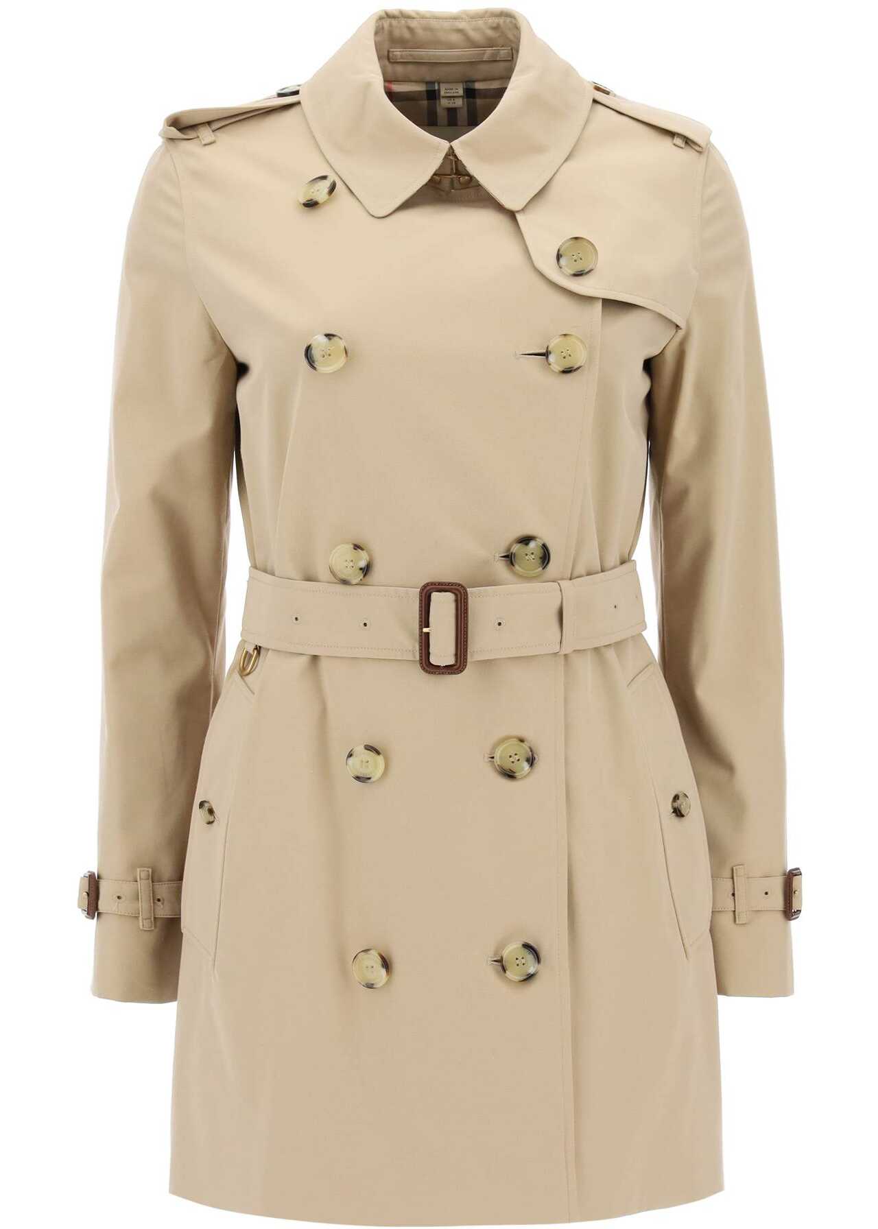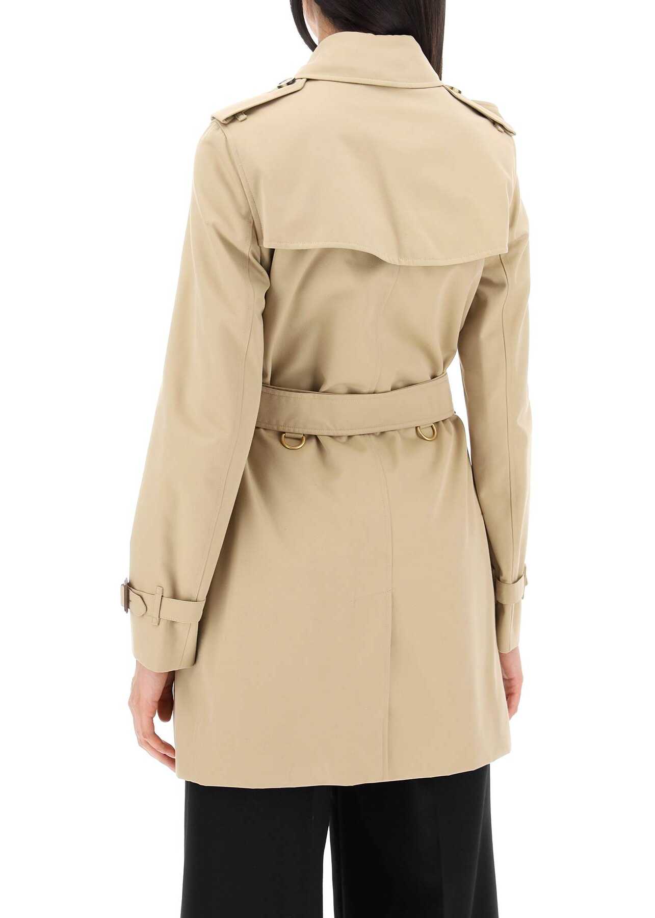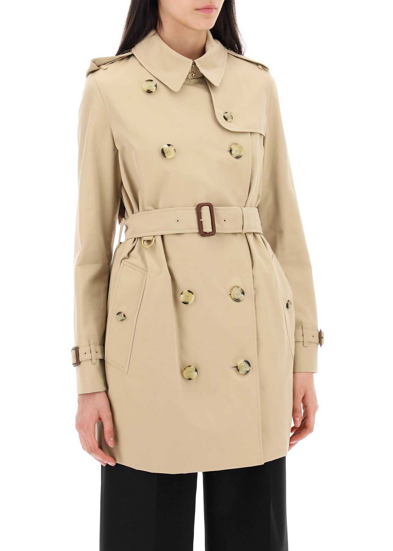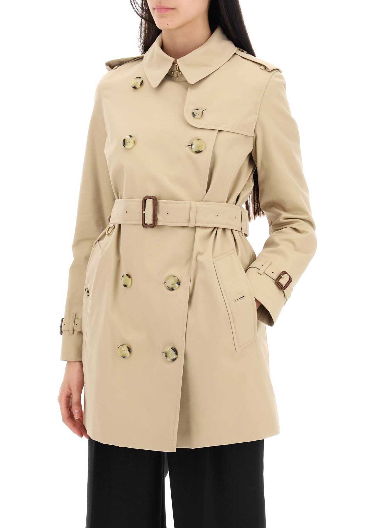 The iconic Kensington trench coat, a staple of Burberry collections, is presented here in its shortest version. Made as per tradition in rainproof cotton gabardine, it comes in a straight silhouette that can be adjusted at the waist with the matching belt. The double-breasted design is finished with set-in sleeves with belted cuffs, shoulder epaulettes, and windbreak flaps at front and back. Functional details include buttoned side pockets, collar hook closure and back vent. Leather-covered buckles add a distinguished note, while the cotton tartan lining signs the garment with a signature touch. The model is 177 cm tall and wears size UK 6.