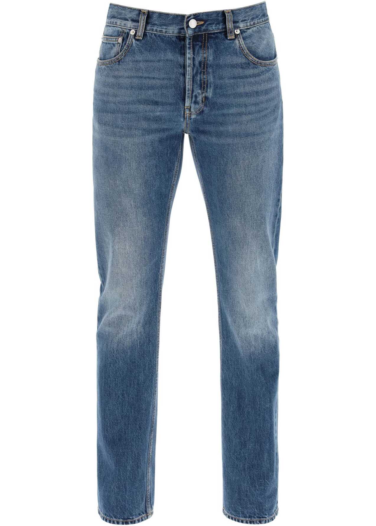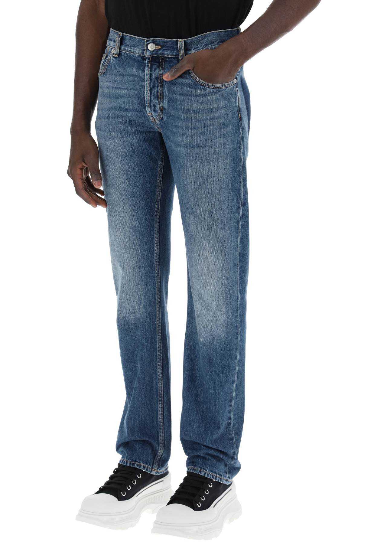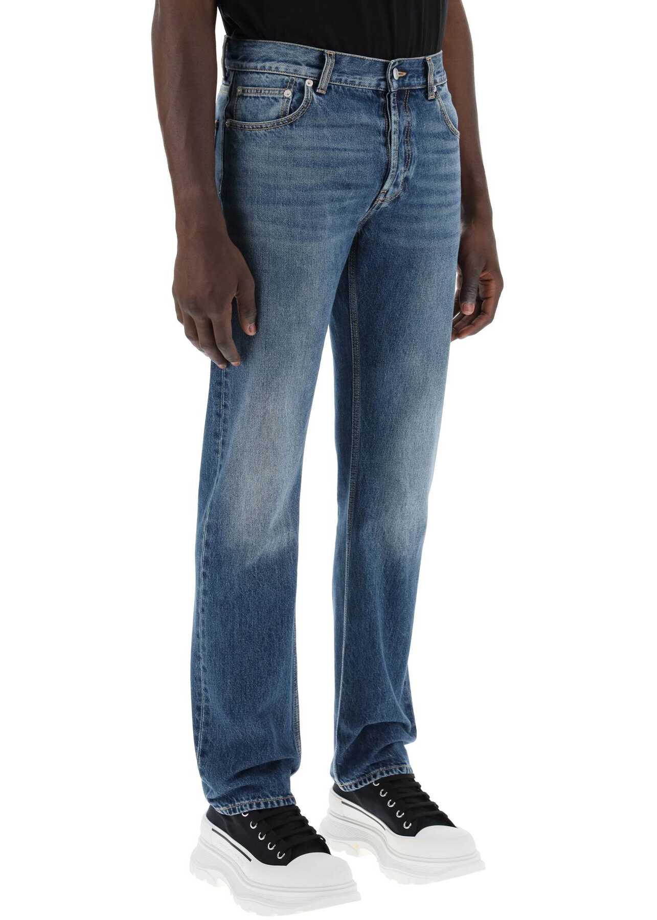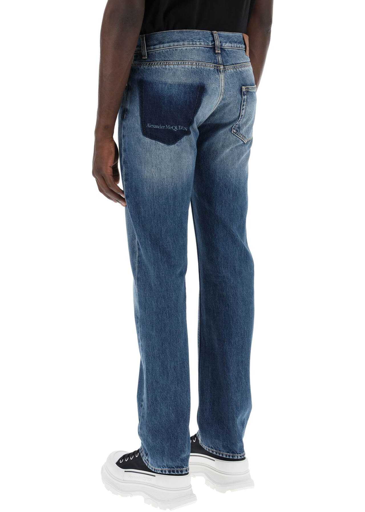 These Alexander McQueen straight leg jeans are made of pure cotton denim with a medium wash and distressed look. They feature hidden button closure, a back jacron patch, and a printed faux pocket on the back with contrasting logo lettering. The model is 187 cm tall and wears size IT 48.