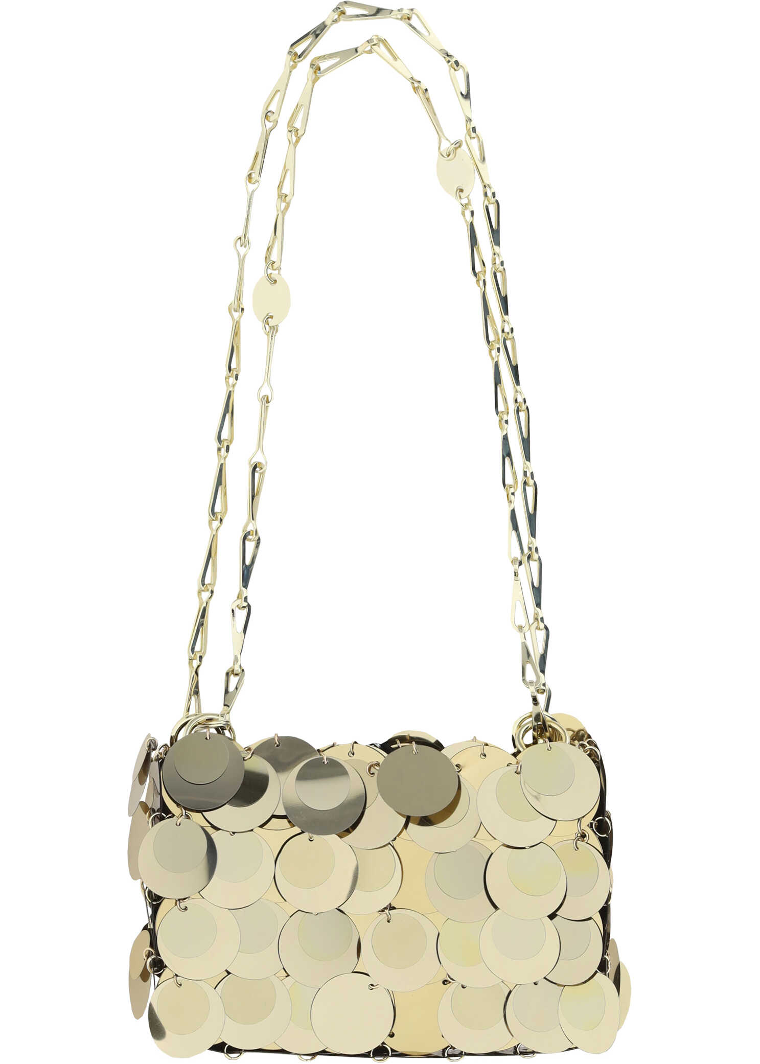 Sparkle Nano Shoulder Bag by Rabanne, single interior compartment, metal chain strap, monochrome Sparkle sequin design, single interior compartment.