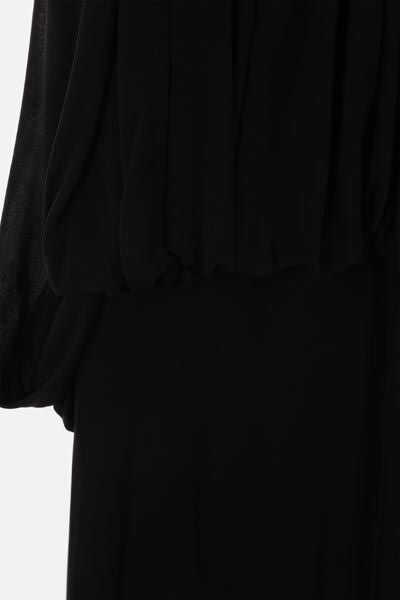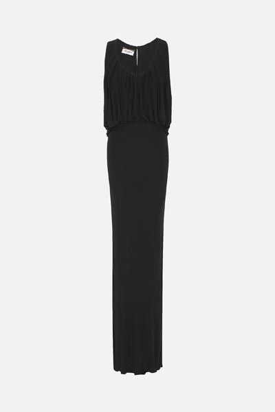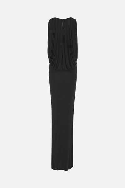 Saint Laurent's sleeveless dress crafted in black cupro jersey. Featuring U-neckline, band shoulder straps, back button closure, drape at chest and fitted skirt. Petticoat lining.