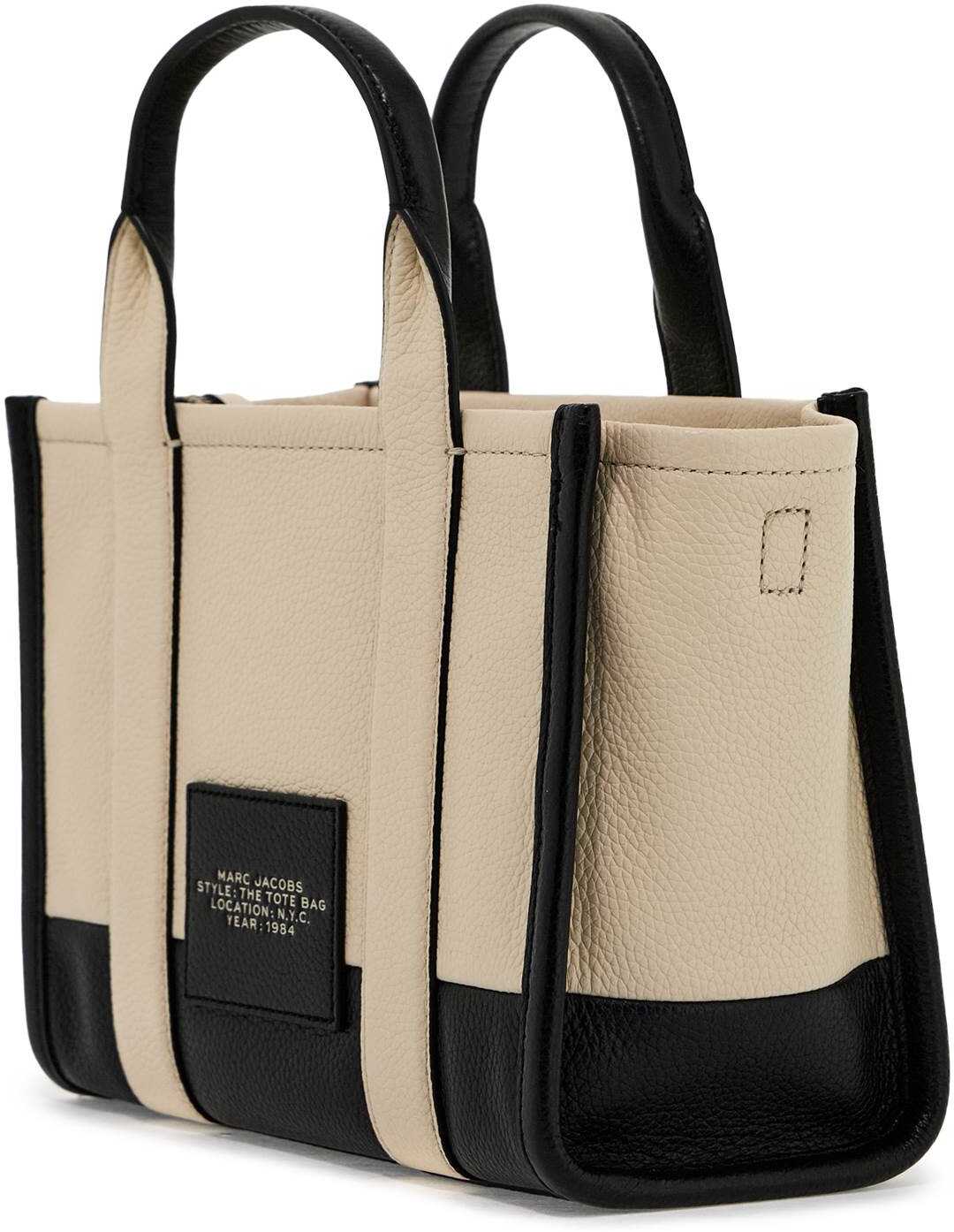 The Colorblock Small Tote bag by Marc Jacobs in two-tone grained leather, featuring double top handle, adjustable and removable shoulder strap, front debossed logo, back leather logo patch, zip closure and side handle. Fabric-lined interior with a zippered pocket. Silver-finished metalware.