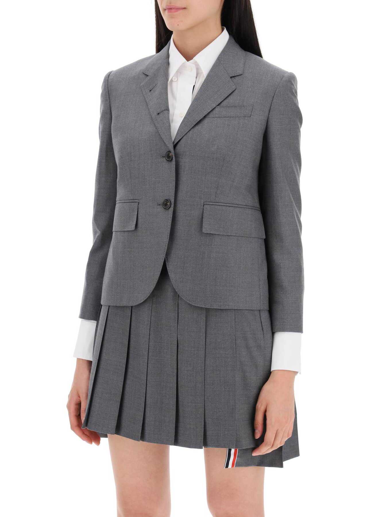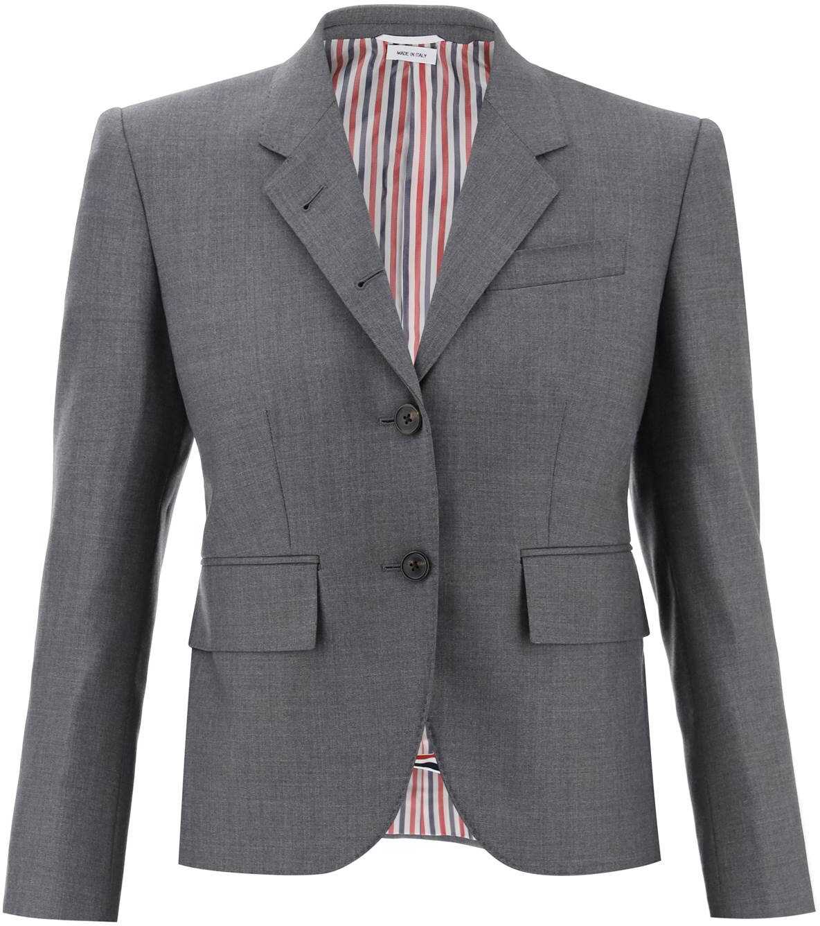 Thom Browne structured jacket in 120's wool twill, detailed with four-button cuffs with iconic tricolor grosgrain ribbon. It features a three-button single-breasted closure, flap pockets, chest pocket, and double back vent. Tricolor grosgrain loop on the upper back. Interior lined in striped cupro with three welt pockets. Regular fit with cropped cut. The model is 177 cm tall and wears a size IT 38.