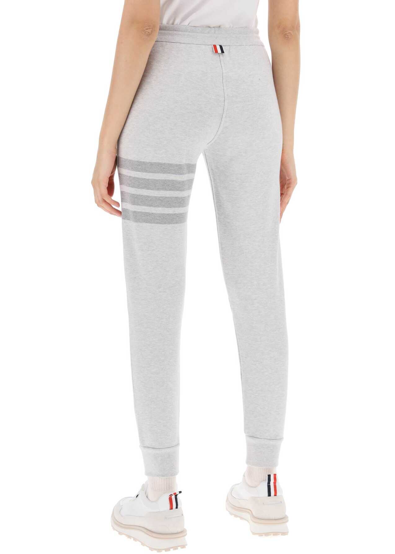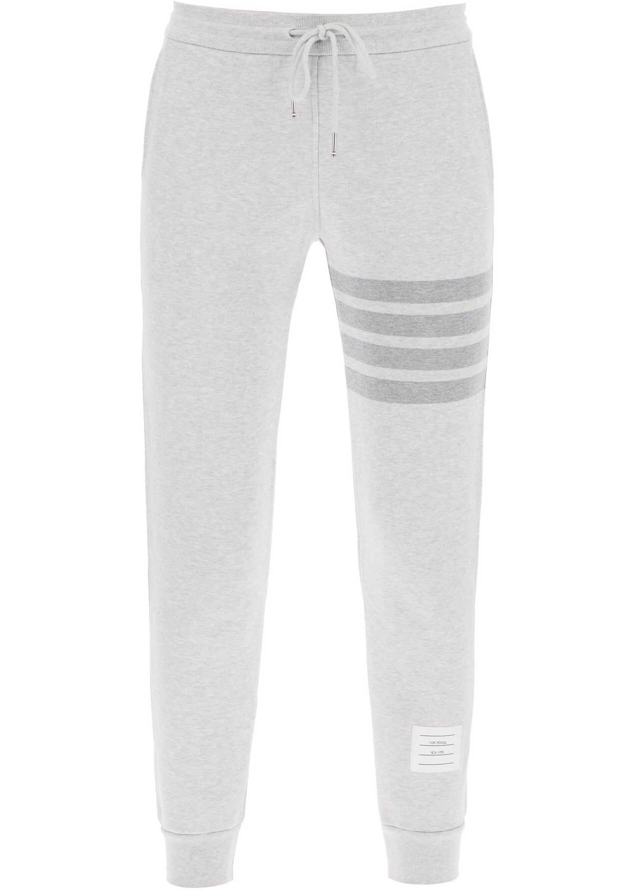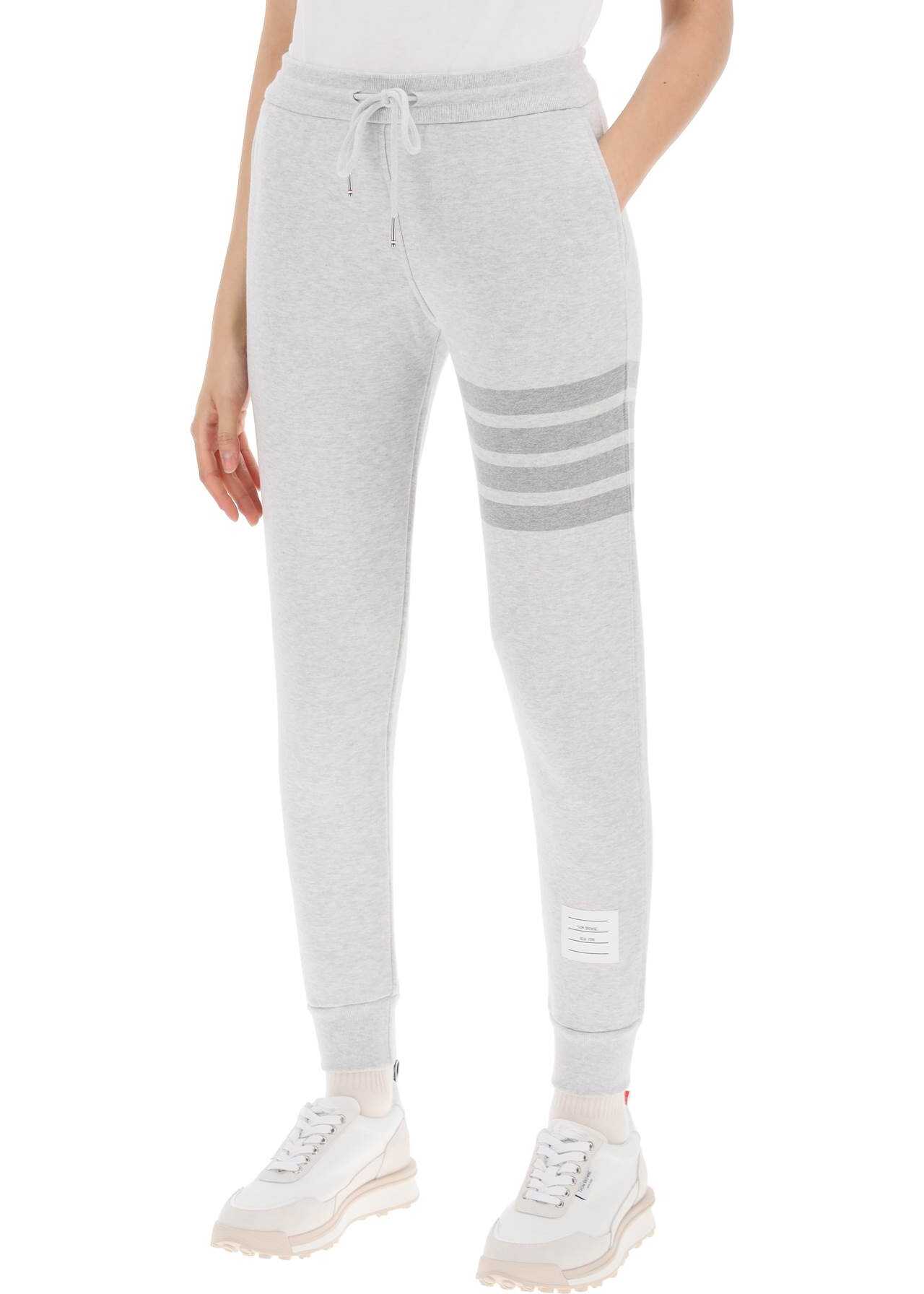 Perfect for elevating an athleisure look, these joggers with drawstring feature the signature of Thom Browne in the form of the iconic 4-Bar motif engineered tonal on the left leg. Made from soft grey mélange French terry cotton, they come in a tapered cut with ribbed waistband and cuffs. The Name Tag appliqué above the ankle and the RWB grosgrain tab on the back of the waist add iconic accents to the piece. The model is