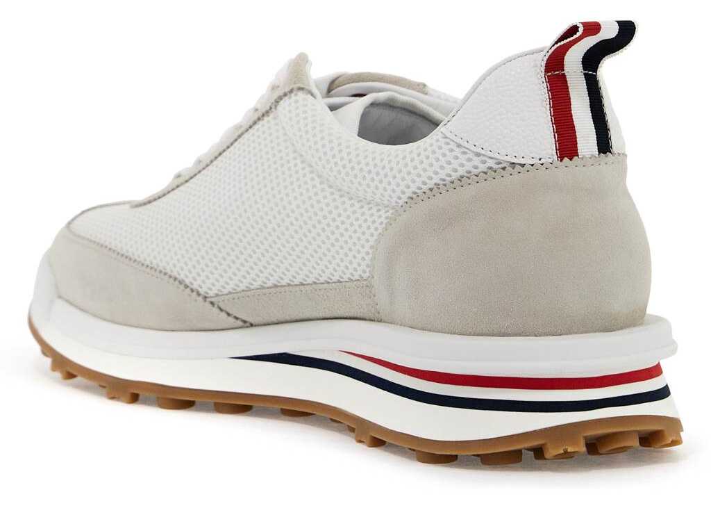 Thom Browne sneakers made of padded mesh and fine suede leather, detailed with a Pebble Grain leather spoiler adorned with the iconic tricolor grosgrain tongue. Logo label on the tongue, leather interior with removable insole and rubber sole with contrasting tread featuring an embossed button pattern. The tricolor detail is repeated on the sole and lace eyelets.