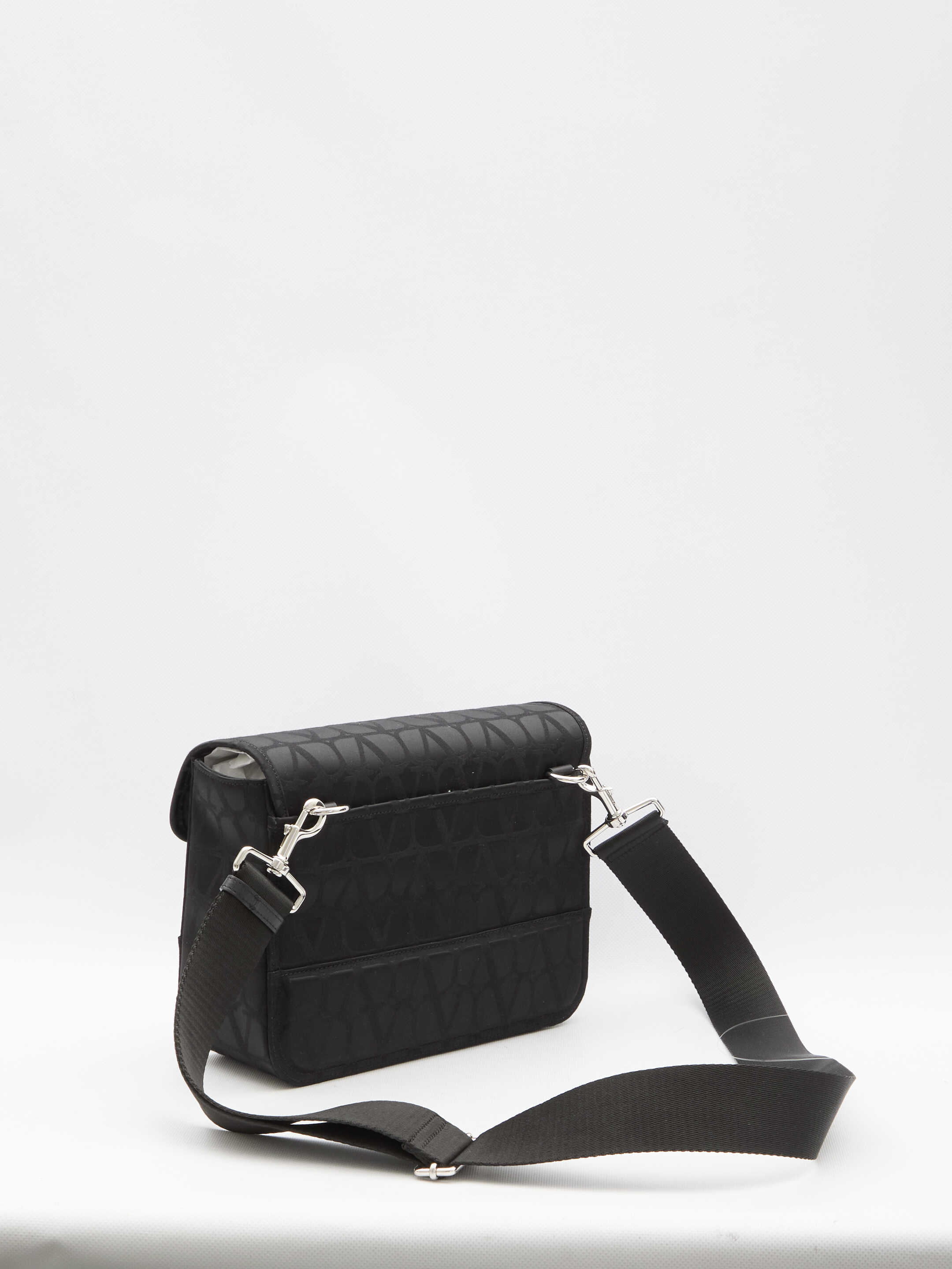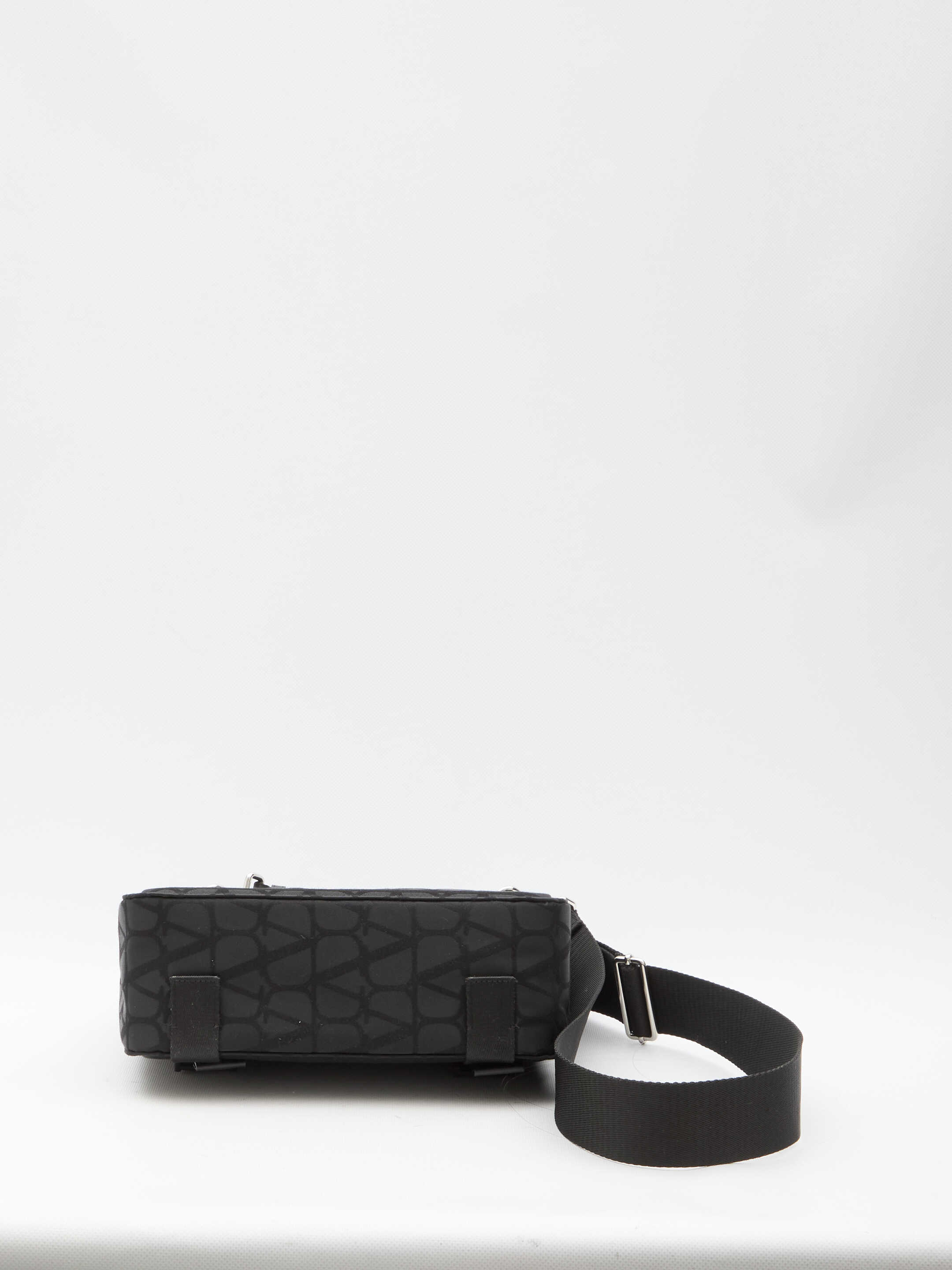 Valentino Garavani crossbody bag in black Toile Iconographe technical fabric with leather details. It features adjustable and detachable shoulder strap, VLogo flap closure, one main interior compartment, one interior zip pocket and one exterior rear flat pocket.