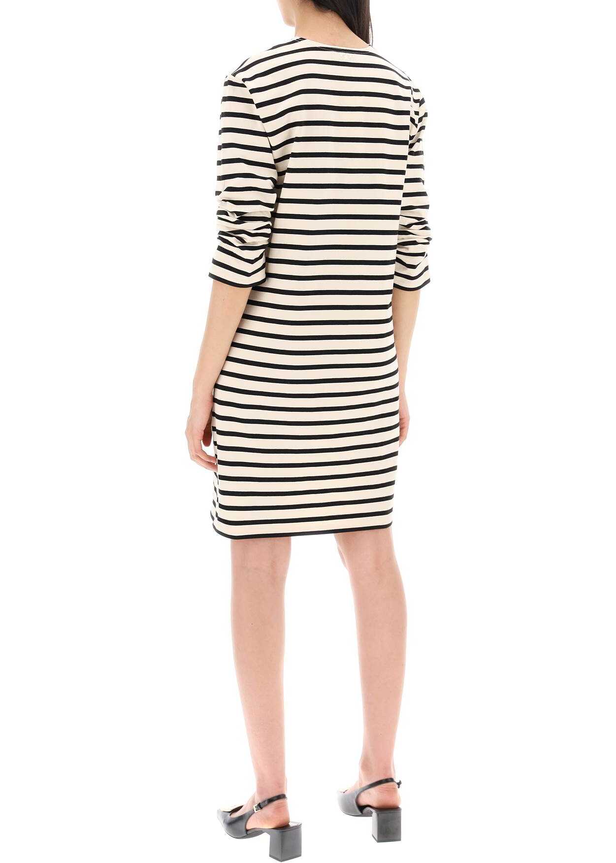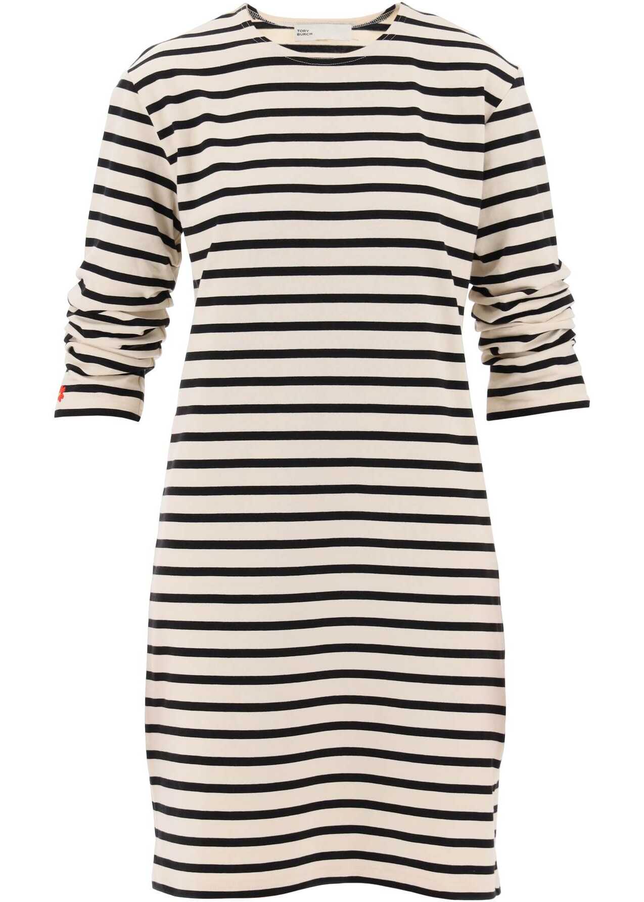 Crafted in compact cotton jersey in ivory and black tones, this Tory Burch crew neck dress is enlivened by a nautical-inspired striped pattern. The silhouette is straight and relaxed for a casual T-shirt style look, with three-quarter sleeves that are gathered at the cuffs. The garment is embroidered with a monogram detail on the back of the collar and a small red flower on the bottom of the right sleeve. The model is 177 cm tall and wears size XS.