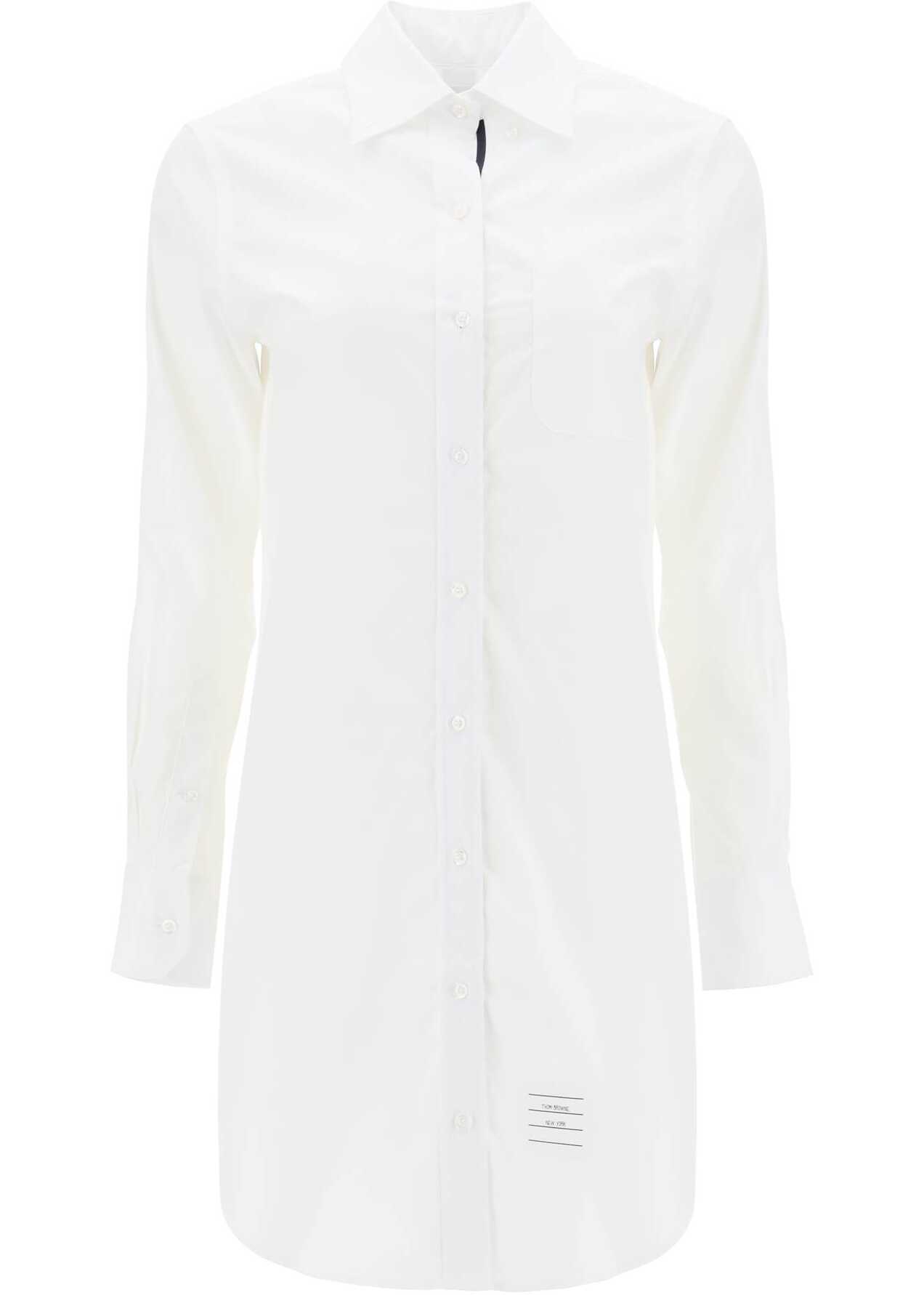 Thom Browne reimagines the classic design of a men's shirt in a short dress with a button-down collar and chest pocket. Made from white cotton poplin, this model stands out for its cannon-style buttoning finished internally with the iconic RWB grosgrain ribbon. The straight cut with curved hem ensures a regular fit. The Name Tag appliqué on the front bottom and tricolor tab on the back add a distinctive touch. The model is 177 cm tall and wears size