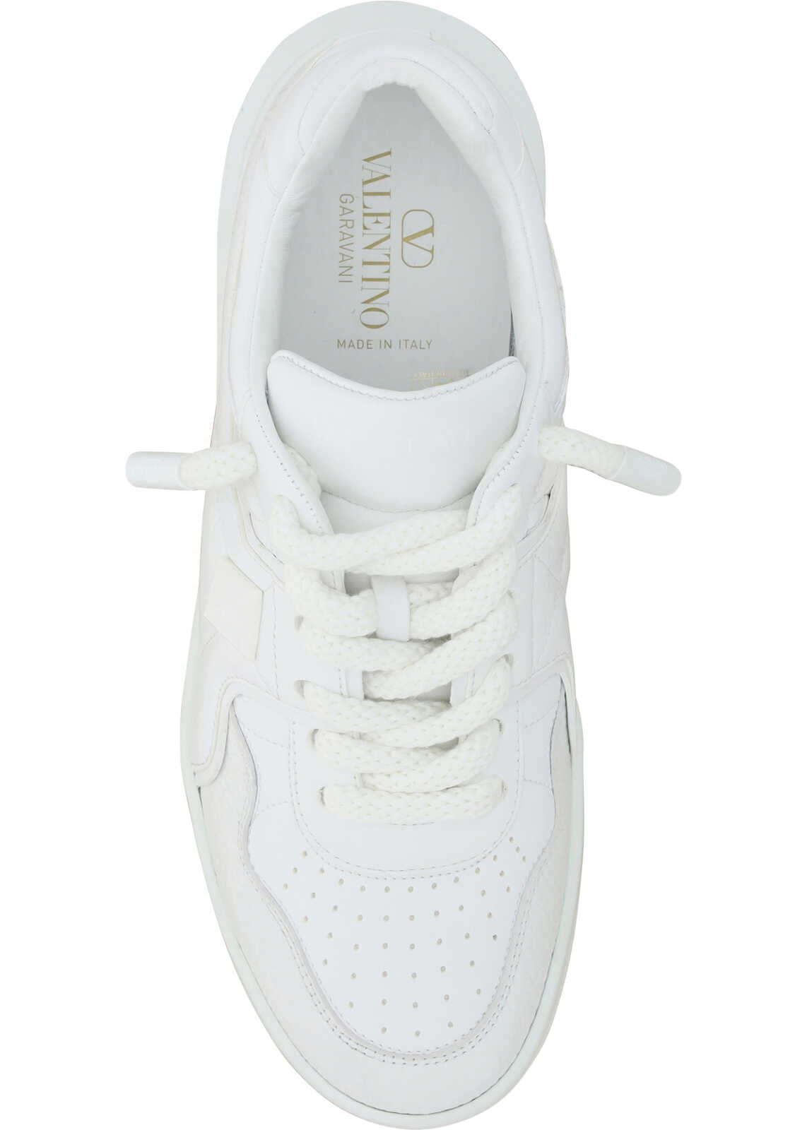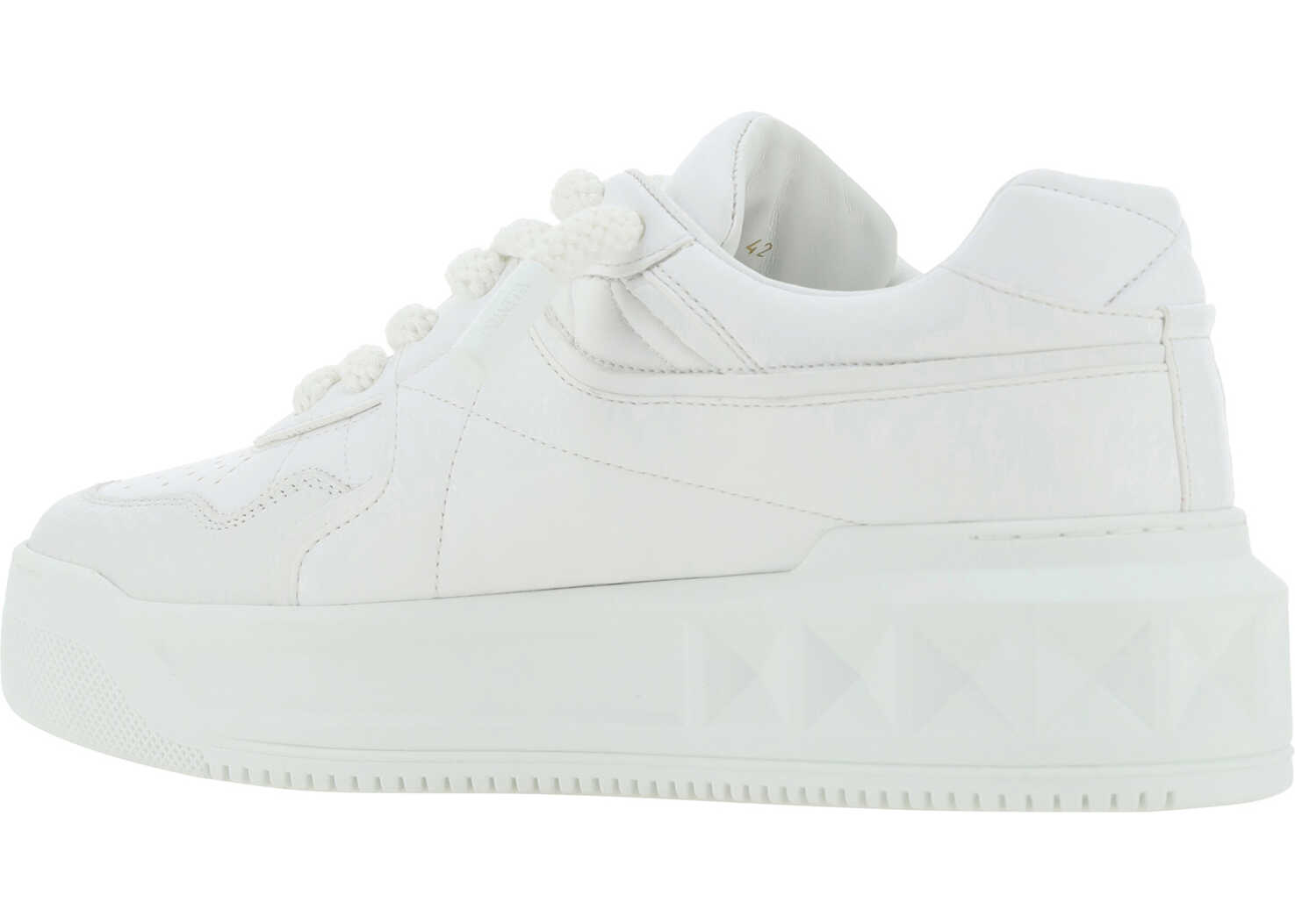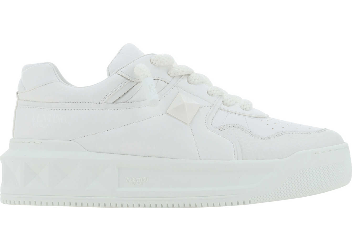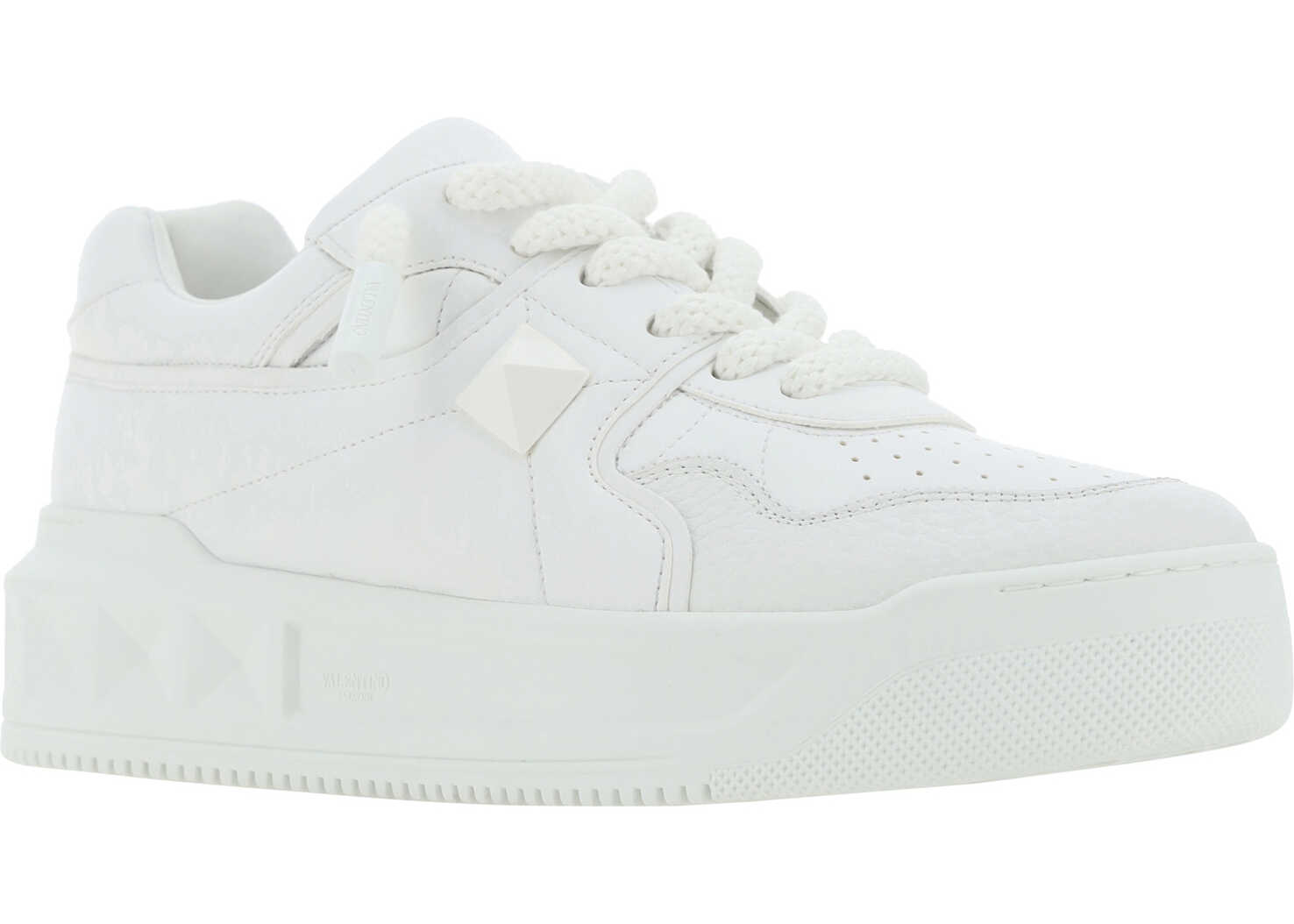 Calfskin One Stud XL Sneakers by Valentino Garavani, round toe, a flat sole, a lace-up front fastening, a brand embossed signature on the front tongue, an iconic brand embossed stud on the side panel, a contrasting textured sole with a studded design.
