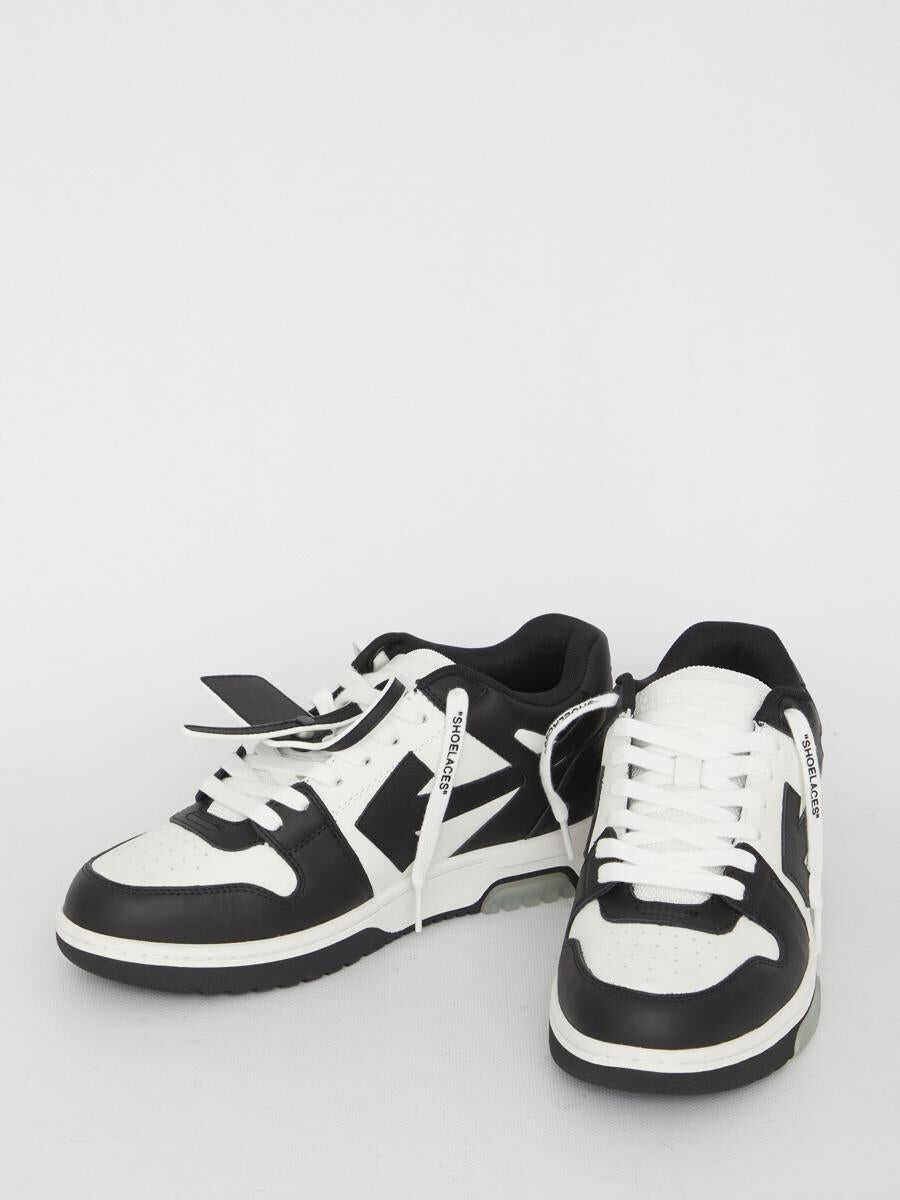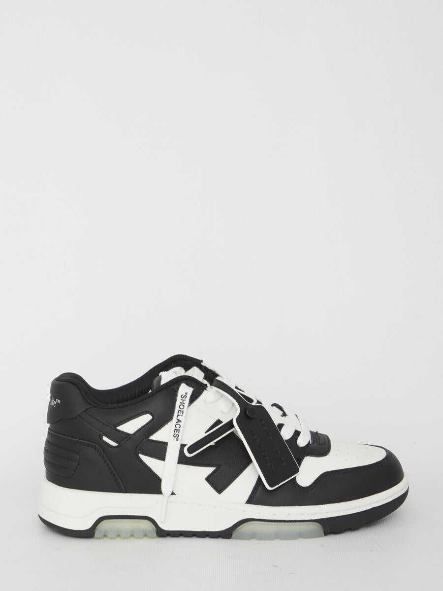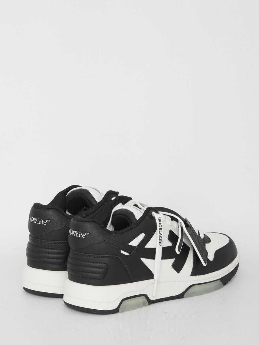 Out Of Office sneakers in black and white leather with grey side arrow. They feature "Shoe Laces" branded lace-up closure, round and perforated toe, Off-White logo on heel, Off-White tag and rubber sole. Any leather imperfections are not to be considered manufacturing defects, but a peculiarity of the material.