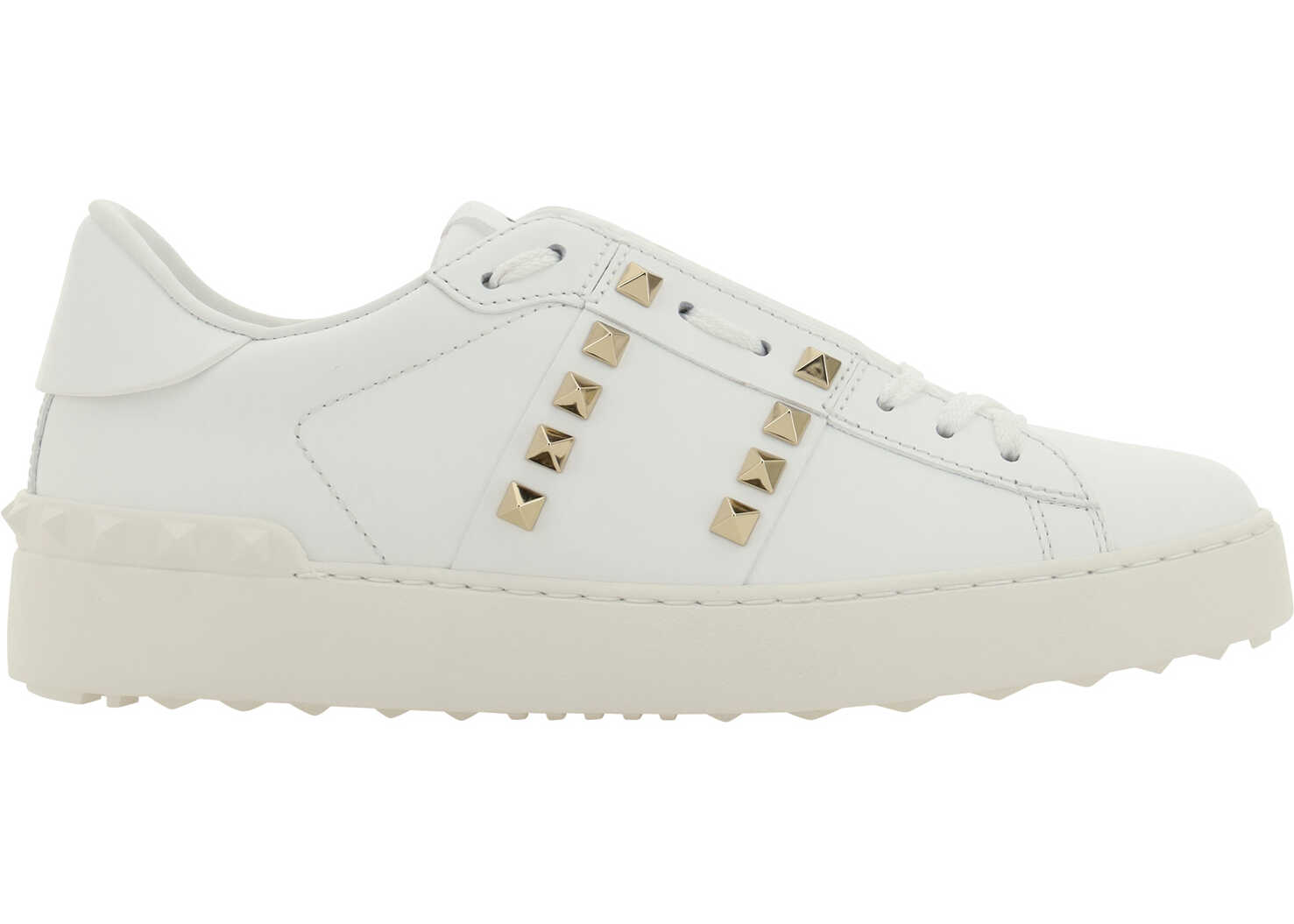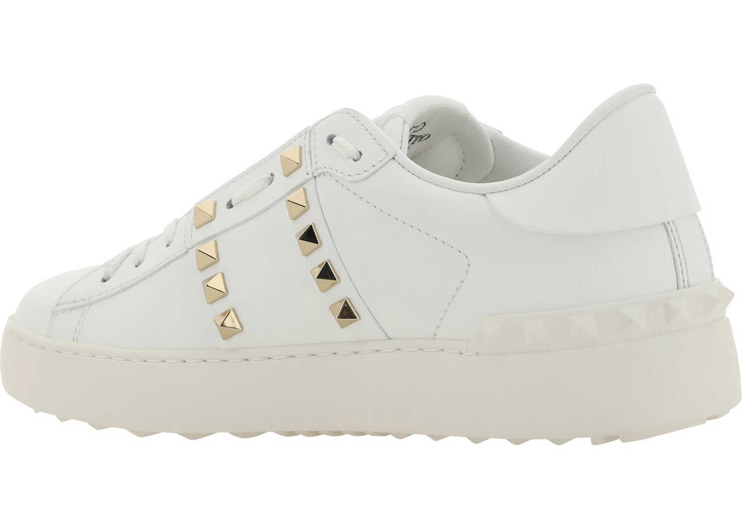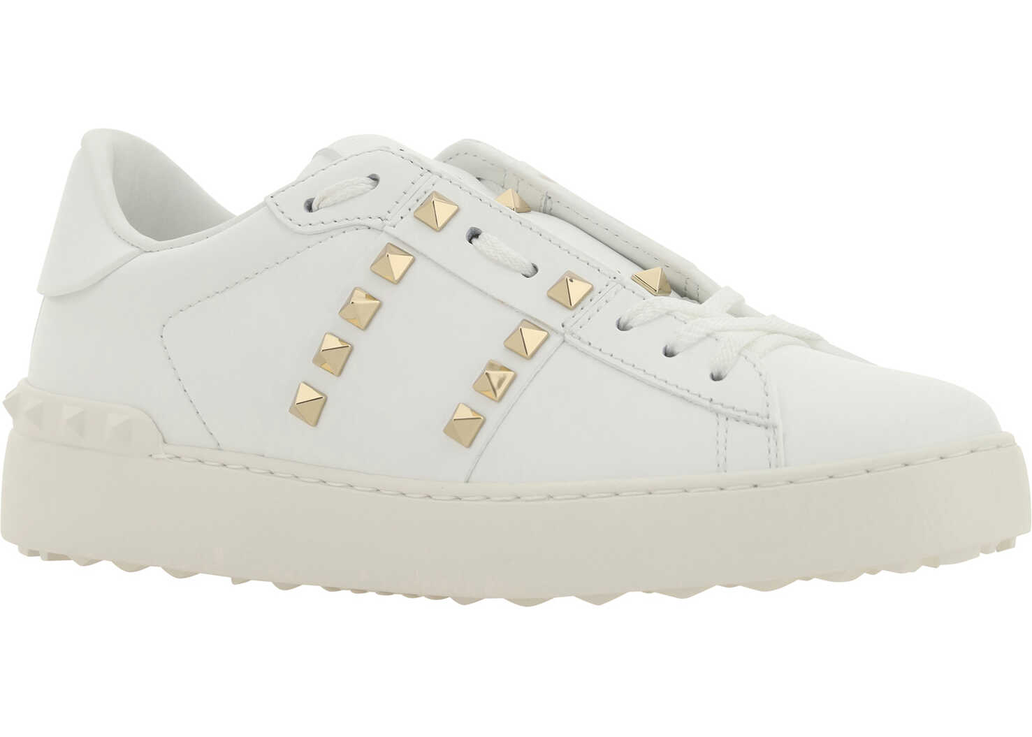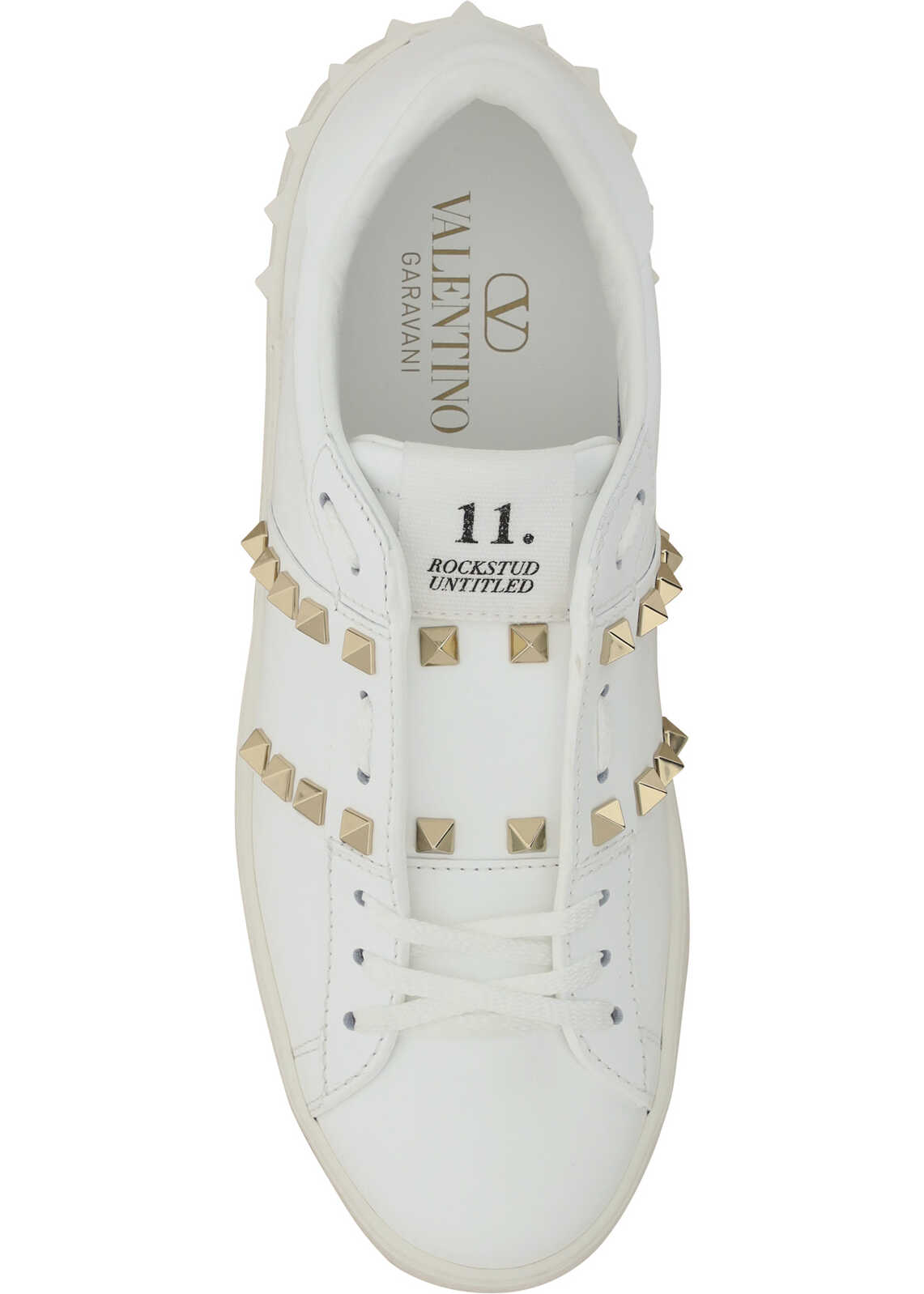 Calfskin Rockstud Untitled Sneakers by Valentino Garavani, slip-on model without laces, round toe on front, knurled sole, contrasting logo label on front tab, iconic Rockstud studs applied on perimeter of sole and side panels.