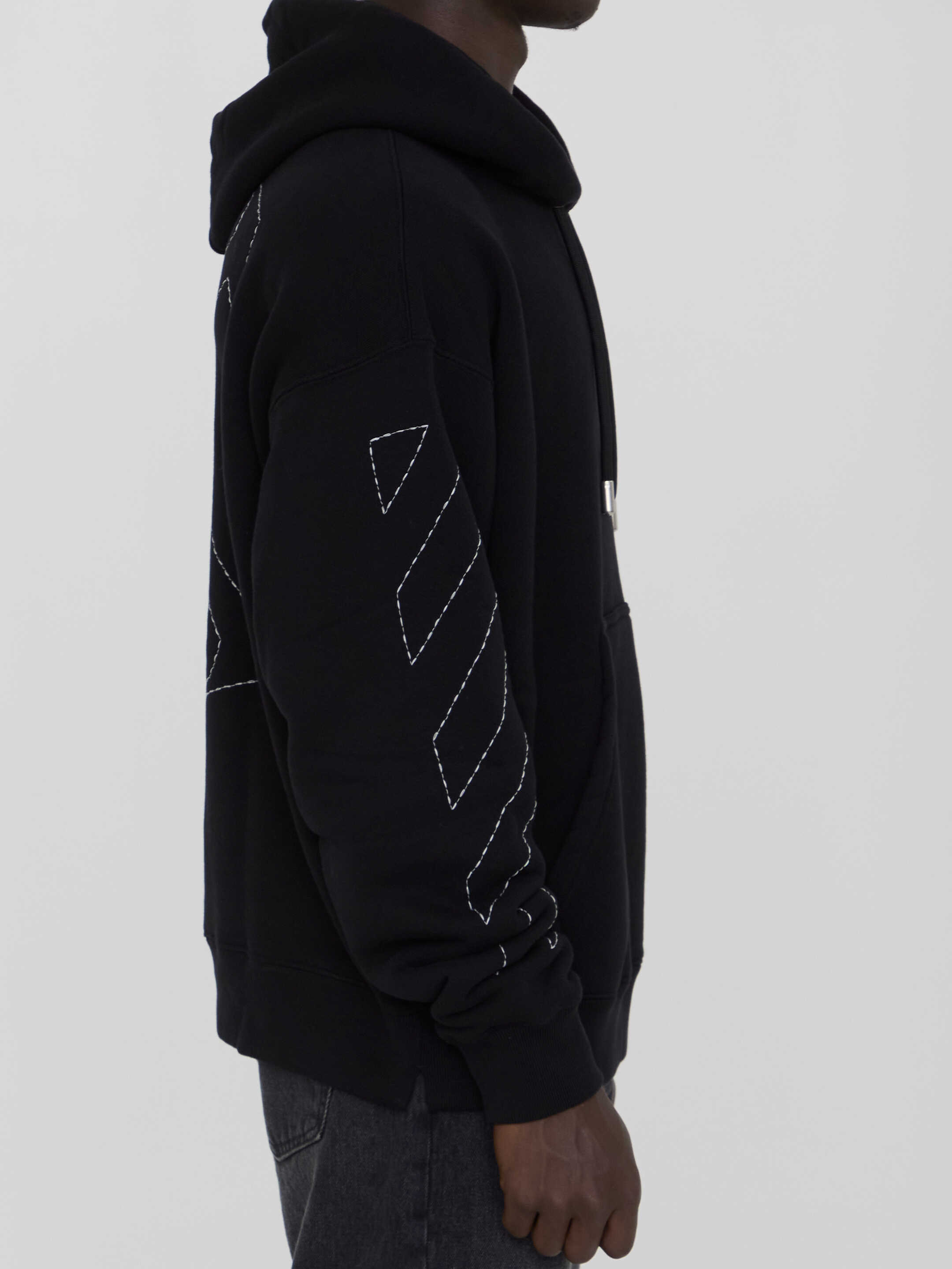 Stitch Arrow Skate hoodie in black cotton with Off logo embroidered on the front and Stitch Arrow Skate motif stitched on the sleeves and on the back. It features drawstring hood, one front kangaroo pocket and ribbed trims on cuffs and hem. Oversized fit.