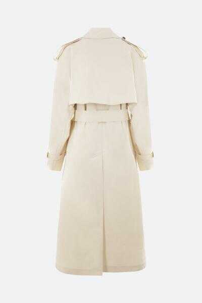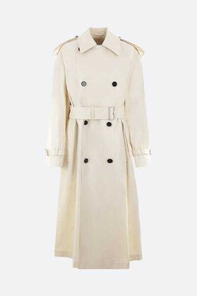 Burberry's double-breasted trench coat crafted in ivory cotton gabardine with removable belt. Featuring wide lapel, button closure, long sleeves with tabs at shoulders and belted cuffs, side pockets, back storm shield, central vent and Burberry Check cotton lining.