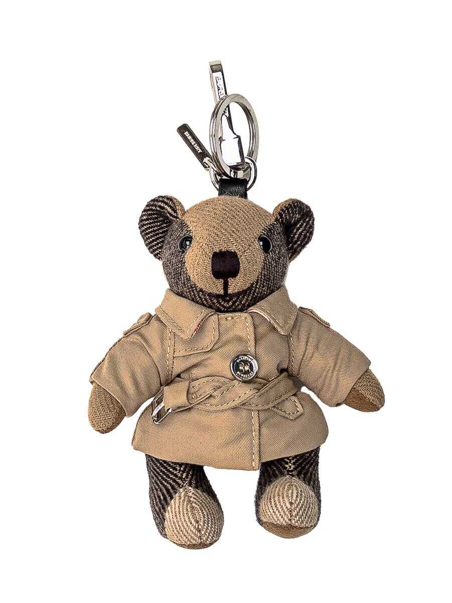 Brown bear charm with Burberry Check all-over pattern and trench coat. Metal hook with logo. Width: 8 Height: 14