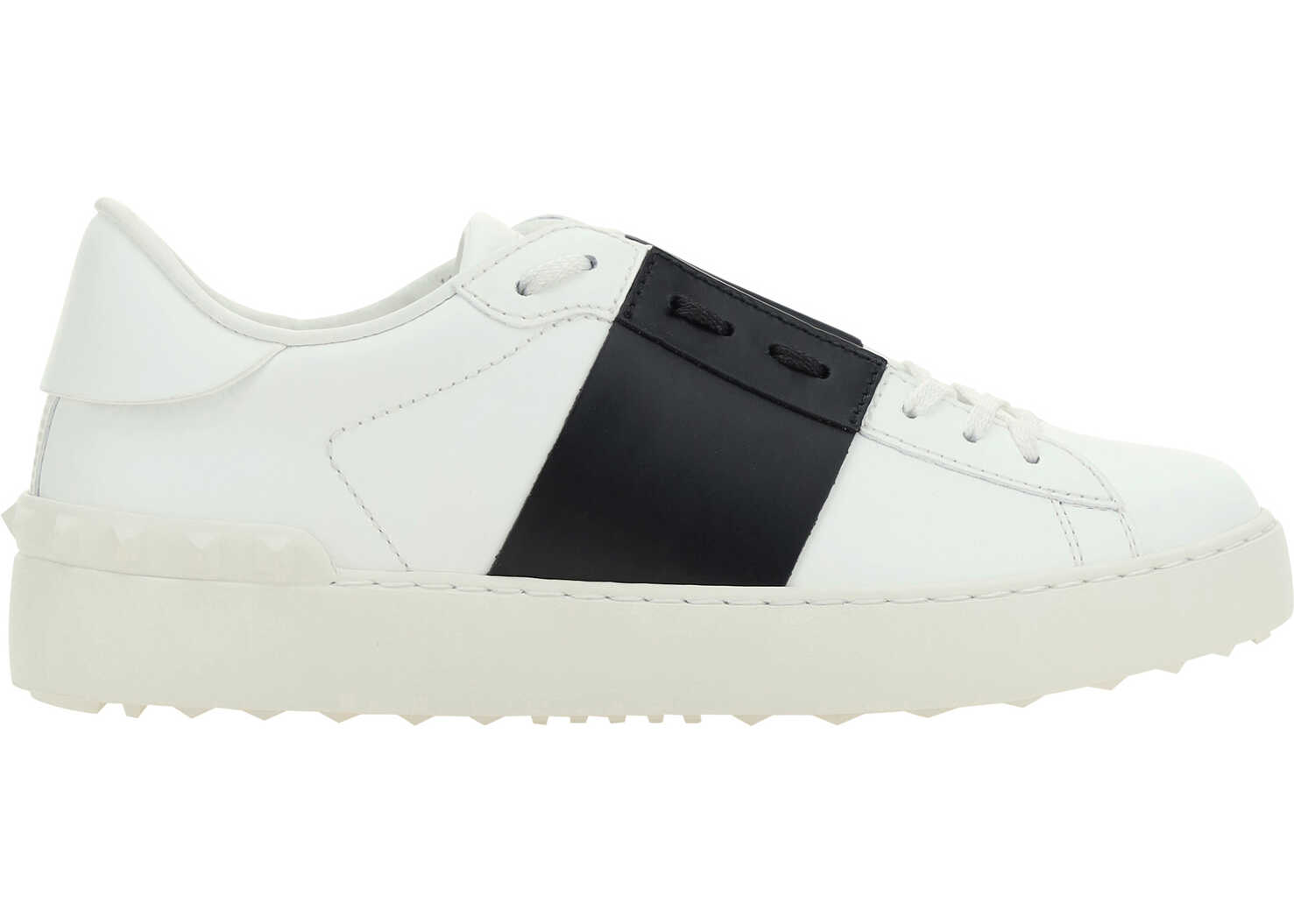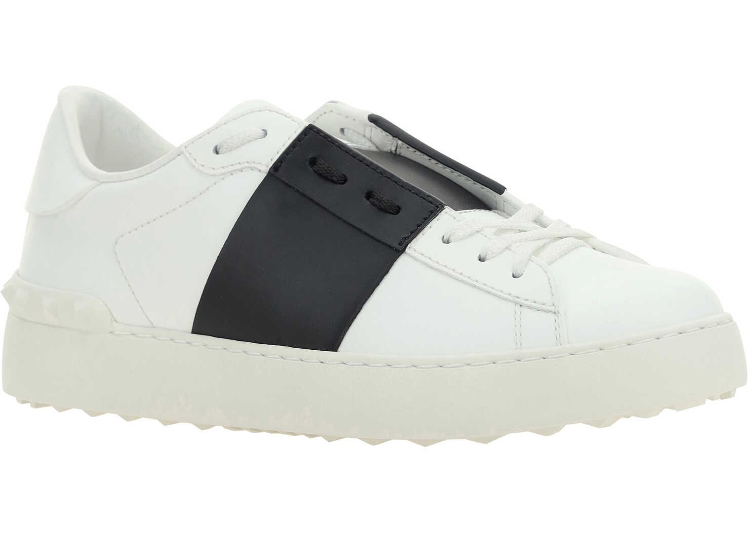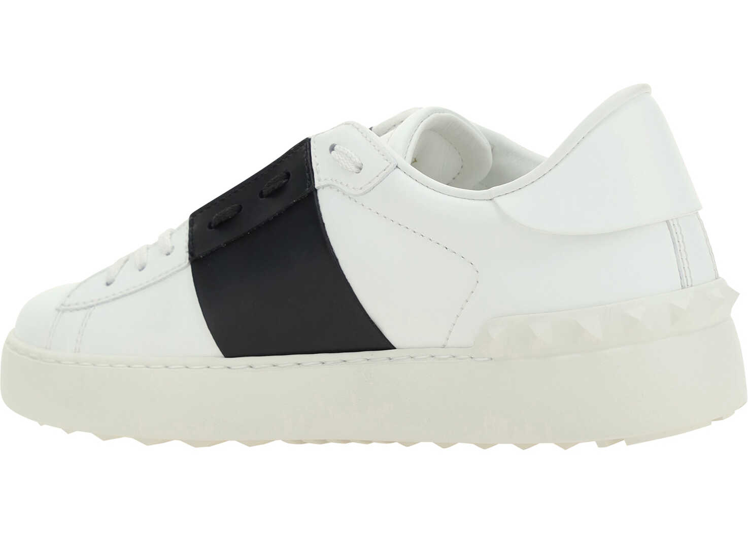 Calfskin Rockstud Open Sneakers by Valentino Garavani, slip-on lace-less style, flat sole with iconic studs on the heel and perimeter of the upper, iconic contrasting monogram on the tongue, contrasting maxi band on the back of the foot.