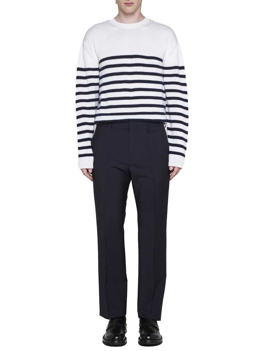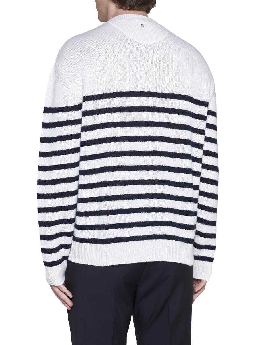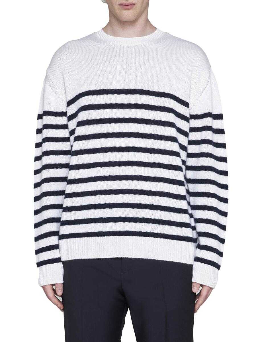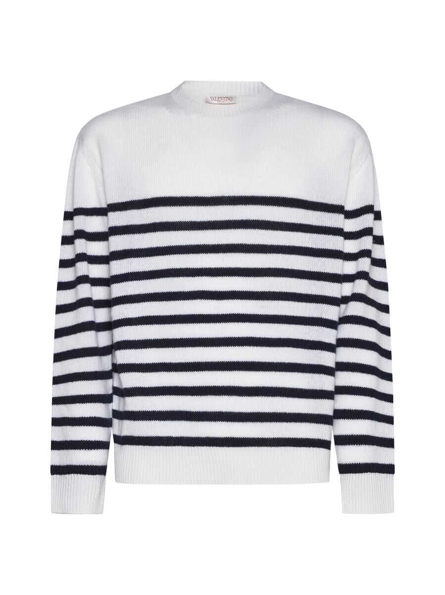 Valentino’s nautical cashmere sweater featuring navy blue stripes on an ivory background, crew neck, iconic stud on the back, dropped shoulders and ribbed edges. The model is wearing accessories and shoes from Valentino Garavani.