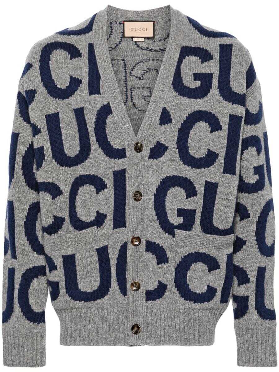 ash grey/navy blue wool knitted construction V-neck intarsia-knit logo front button fastening two front patch pockets long sleeves ribbed-knit edge
