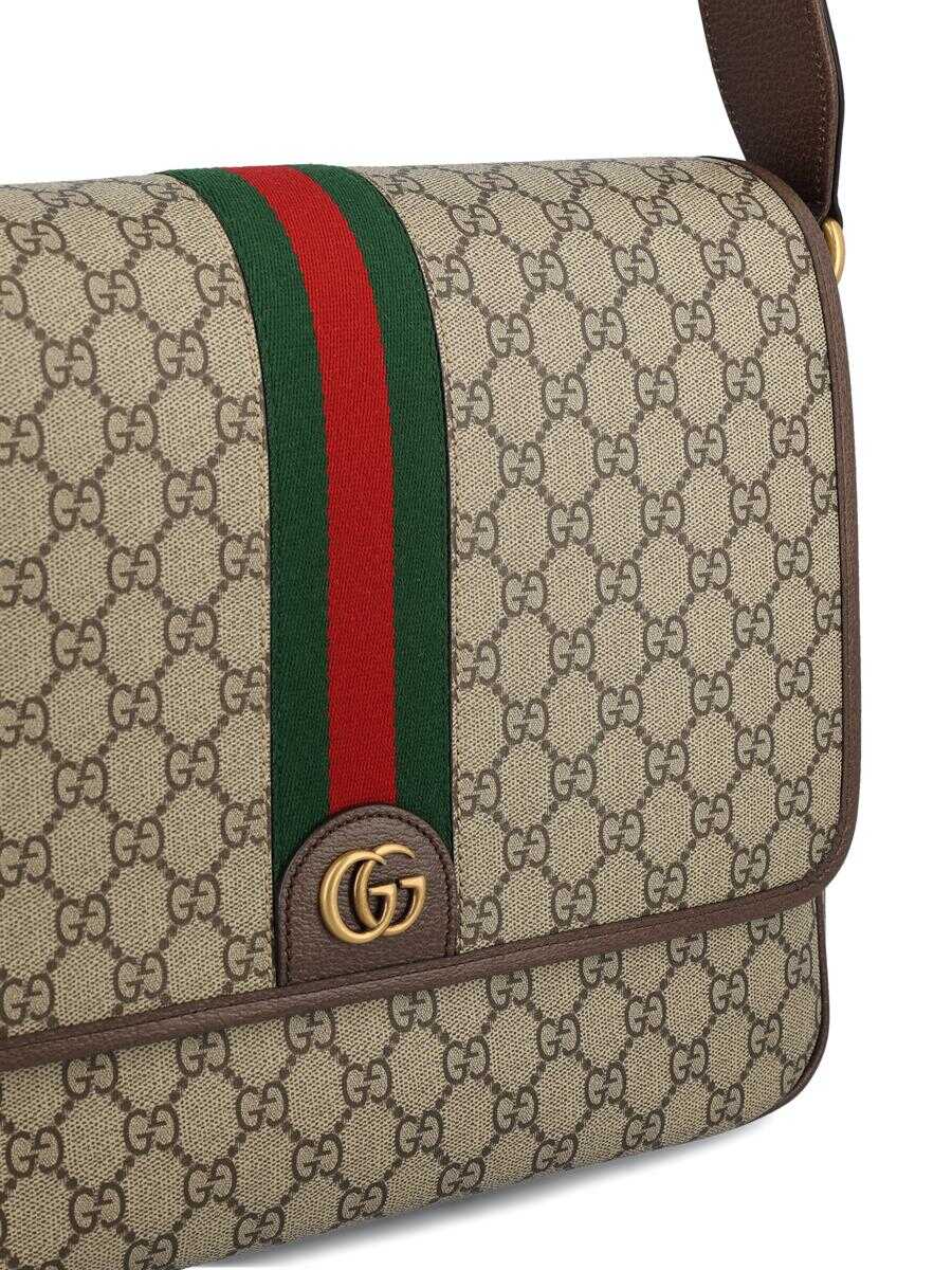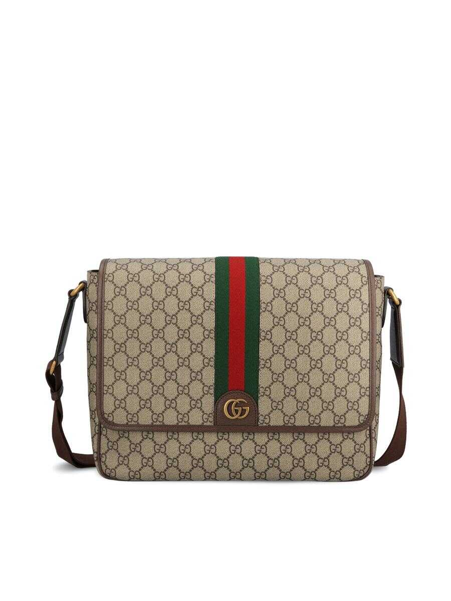 - Material: 100% fabric - Color: beige and brown - Calfskin leather trim - Other details: all-over GG pattern and Web ribbon applied on front - Adjustable shoulder strap - Shoulder strap length: 55 cm - Magnetic button closure - Made in Italy - Dust bag - Item number: 792119FACJQ9741 - Size: 24.5 x 33 x 10 cm