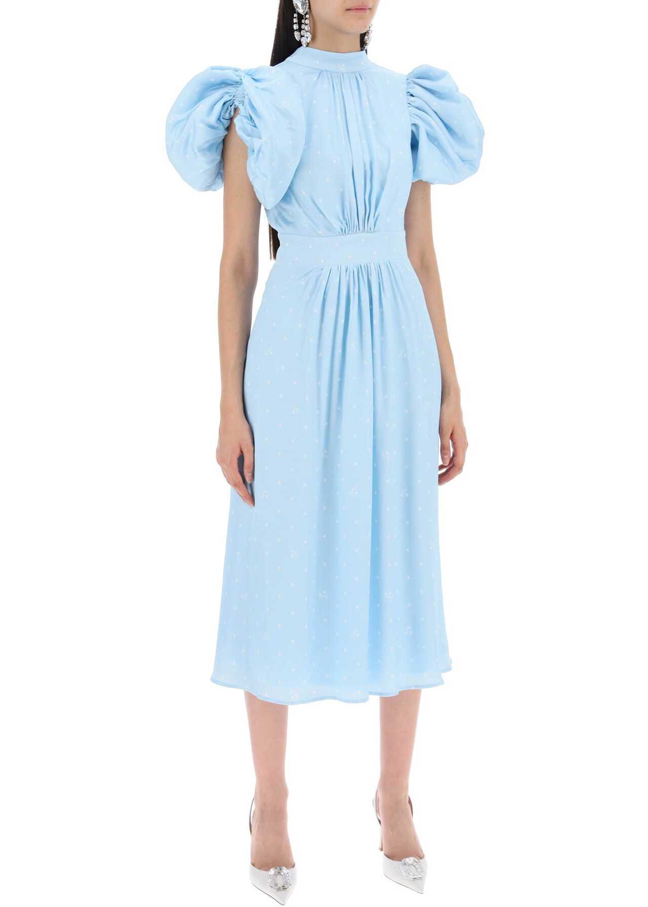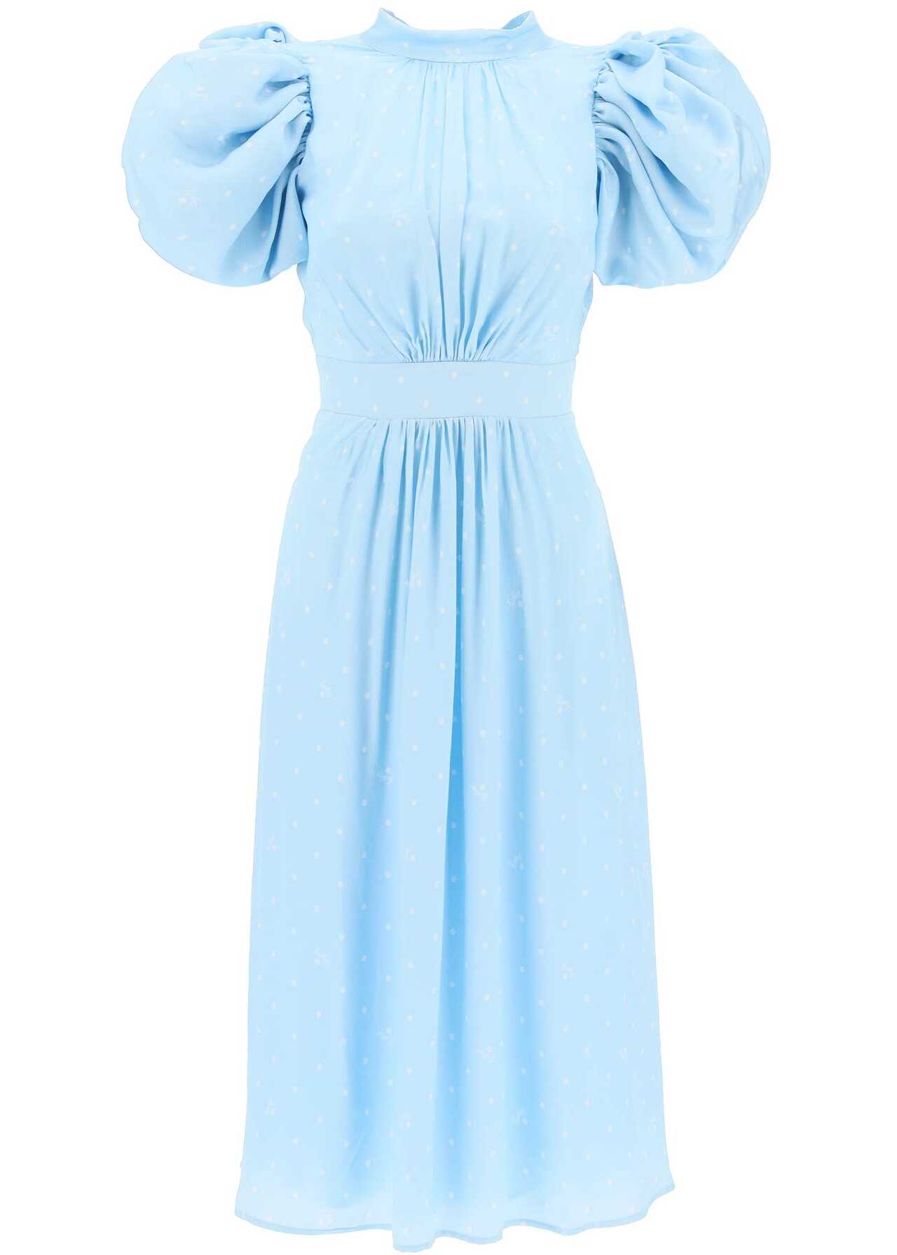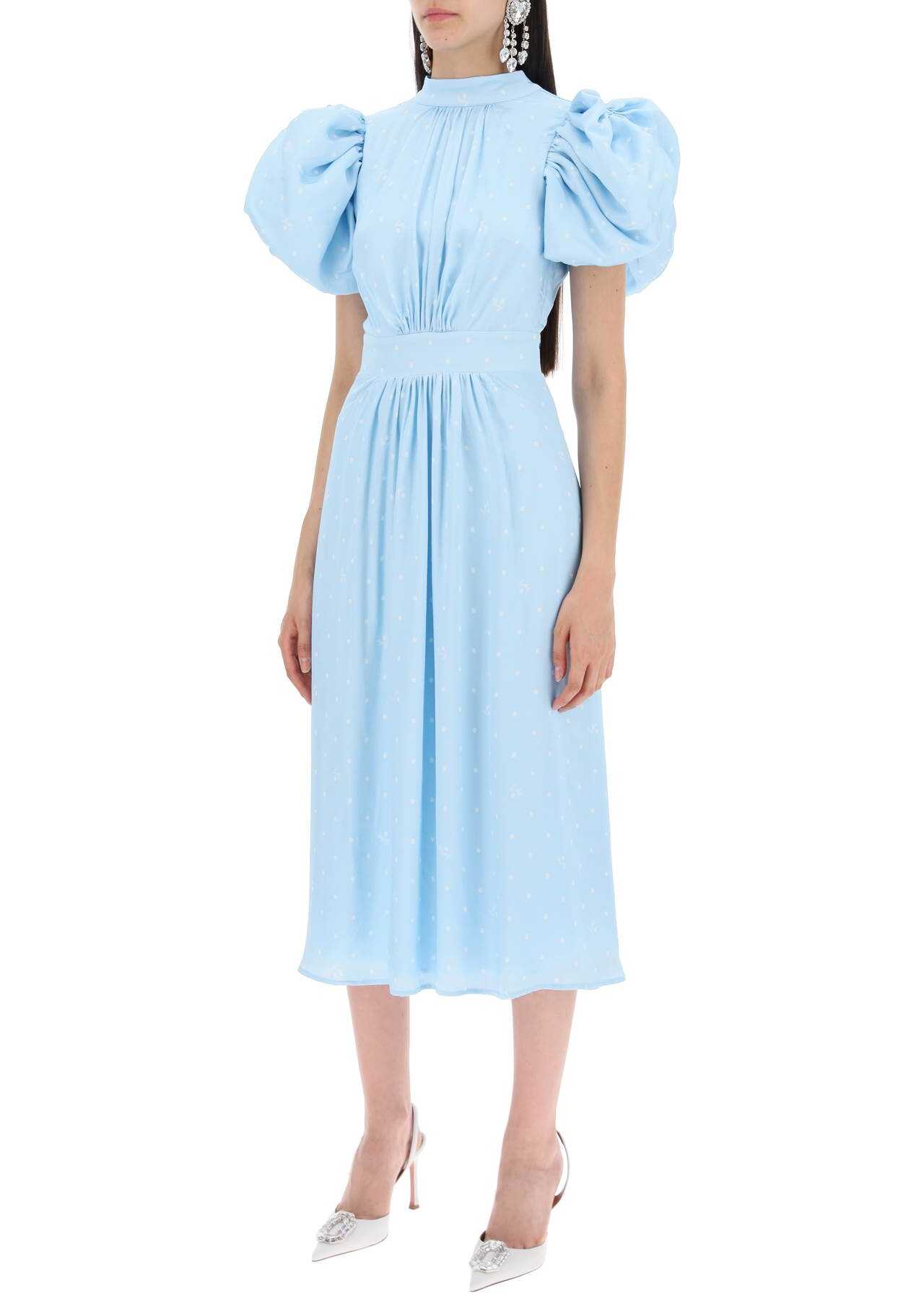 The Rotate midi dress is made of textured viscose with polka dots and features balloon sleeves with a central ruching, a stand-up collar with a cut-out on the back, and tieable laces. The soft silhouette is defined at the waist by ruching details. Fully lined. The model is 177 cm tall and wears an EU size 34.