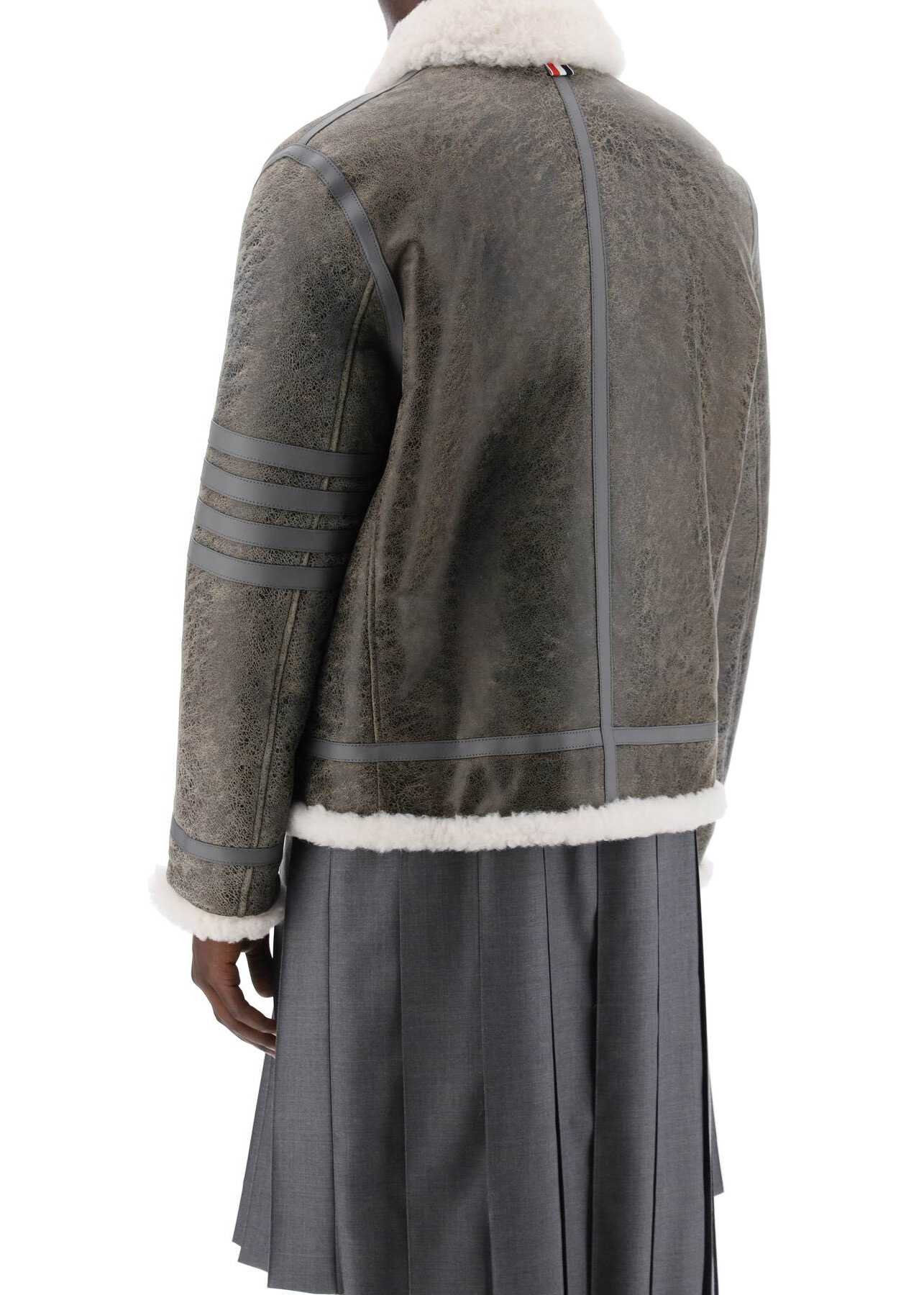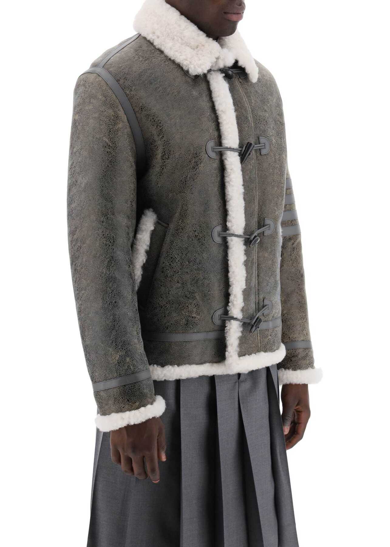 The Montgomery cropped Thom Browne is made of textured shearling and features the iconic 4-Bar leather patch on the left sleeve. It has a wide collar, smooth leather trims, toggle closure, and two large flap pockets on the front. The iconic tri-color grosgrain tab is located at the back of the neck. The model is 187 cm tall and wears size 2 Thom Browne.