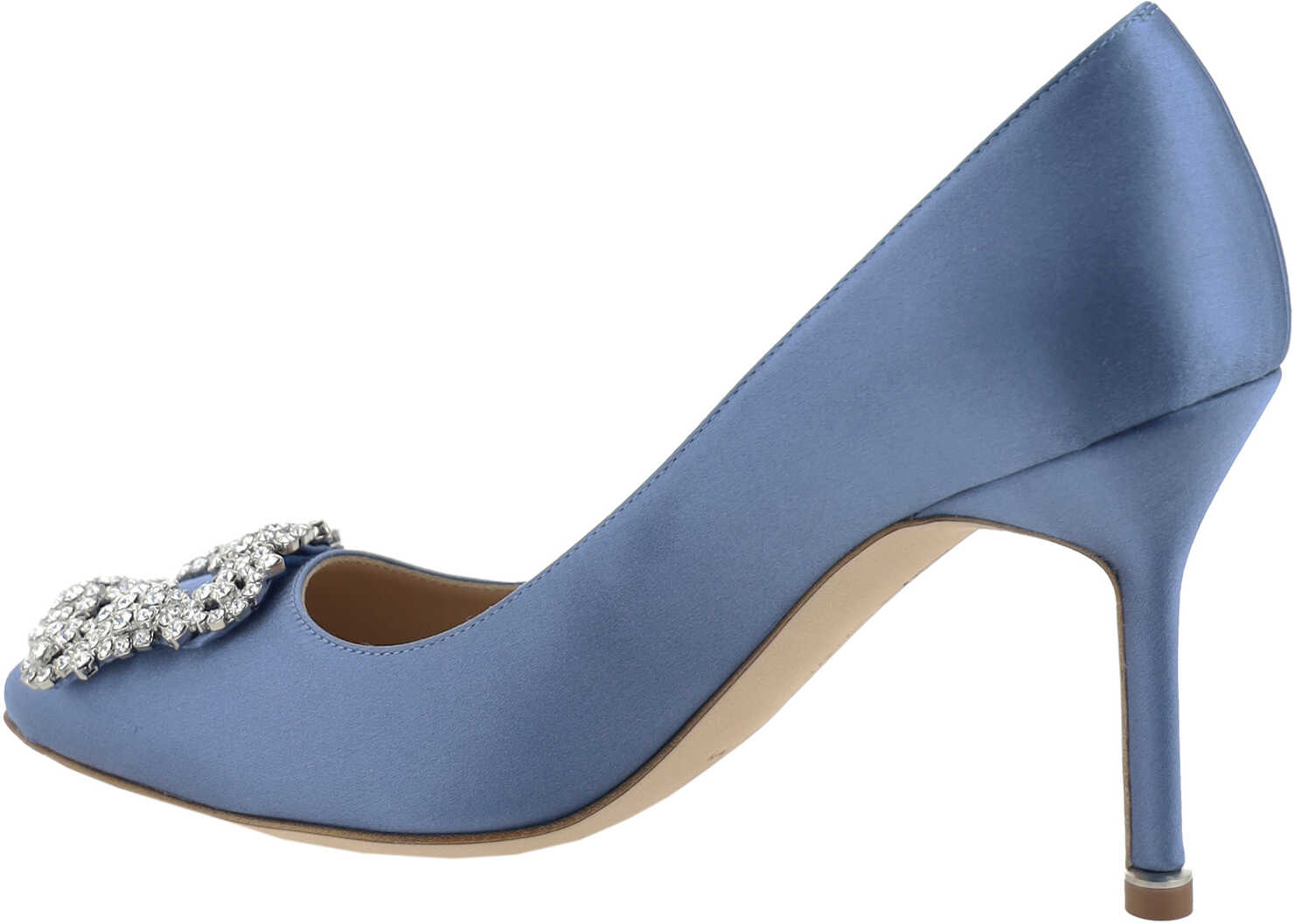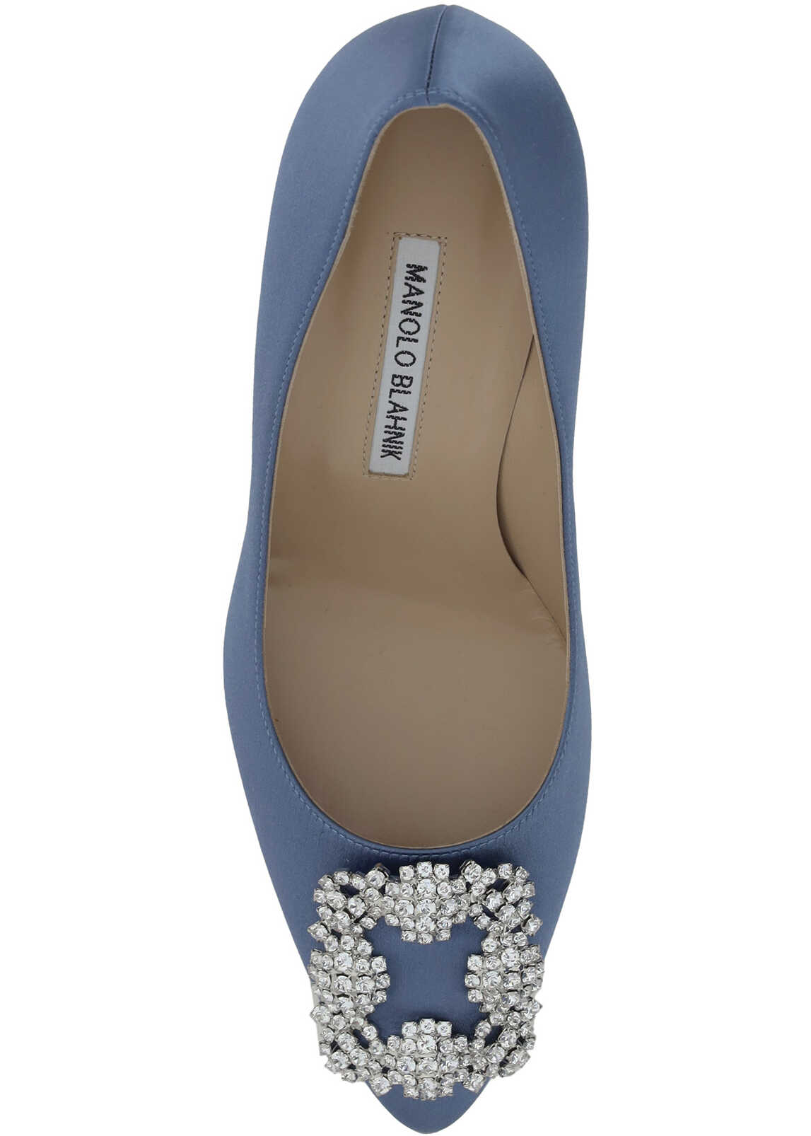 Silk Satin Hangisi Pumps by Manolo Blahnik, almond toe, iconic Swarovski crystal buckle appliqué on front, leather stiletto heel, logo-embossed insole.