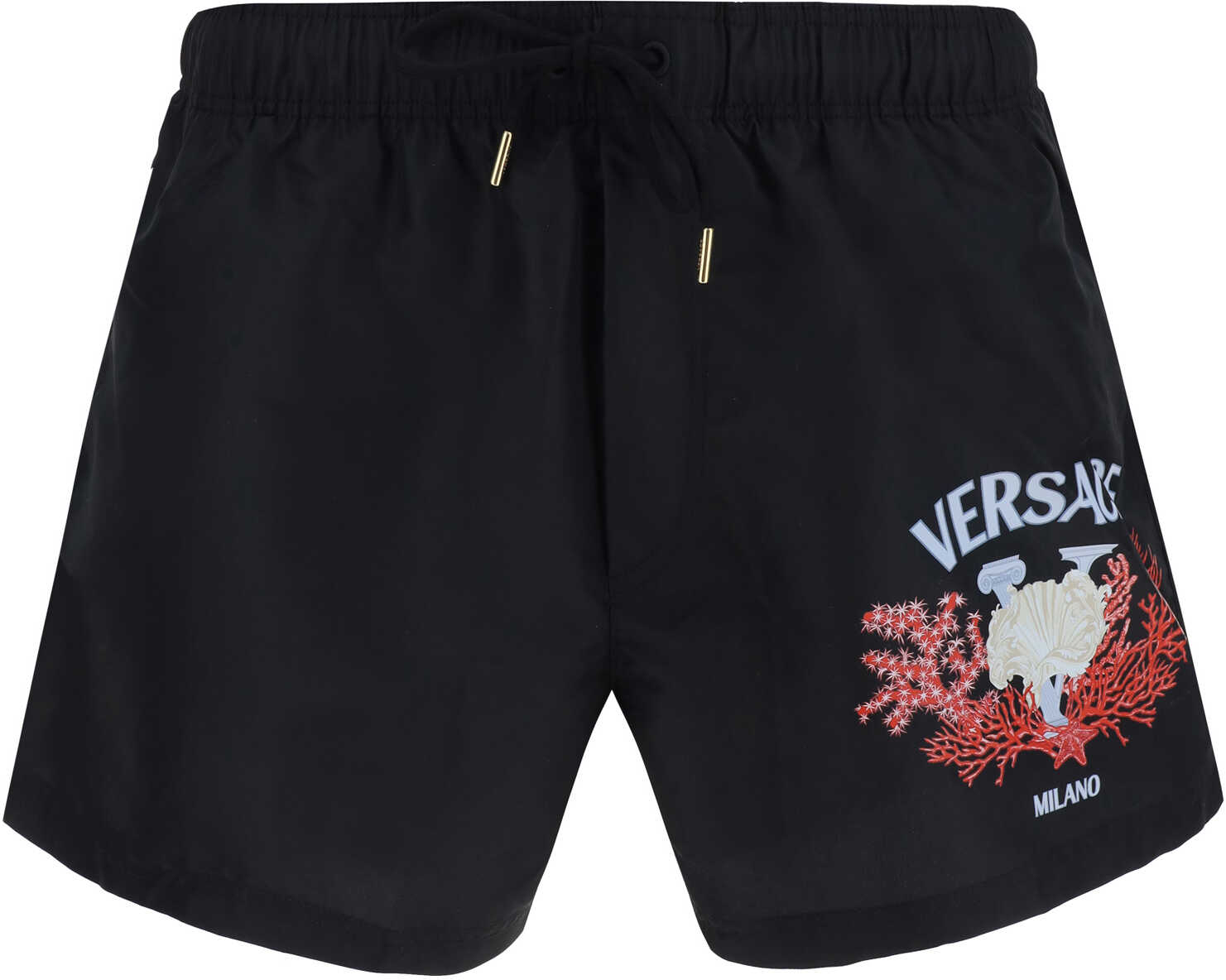 Swimshorts by Versace, elasticated waistband with drawstring, two side welt pockets, patch pocket on back, print with iconic brand monogram detail printed in contrast on front.