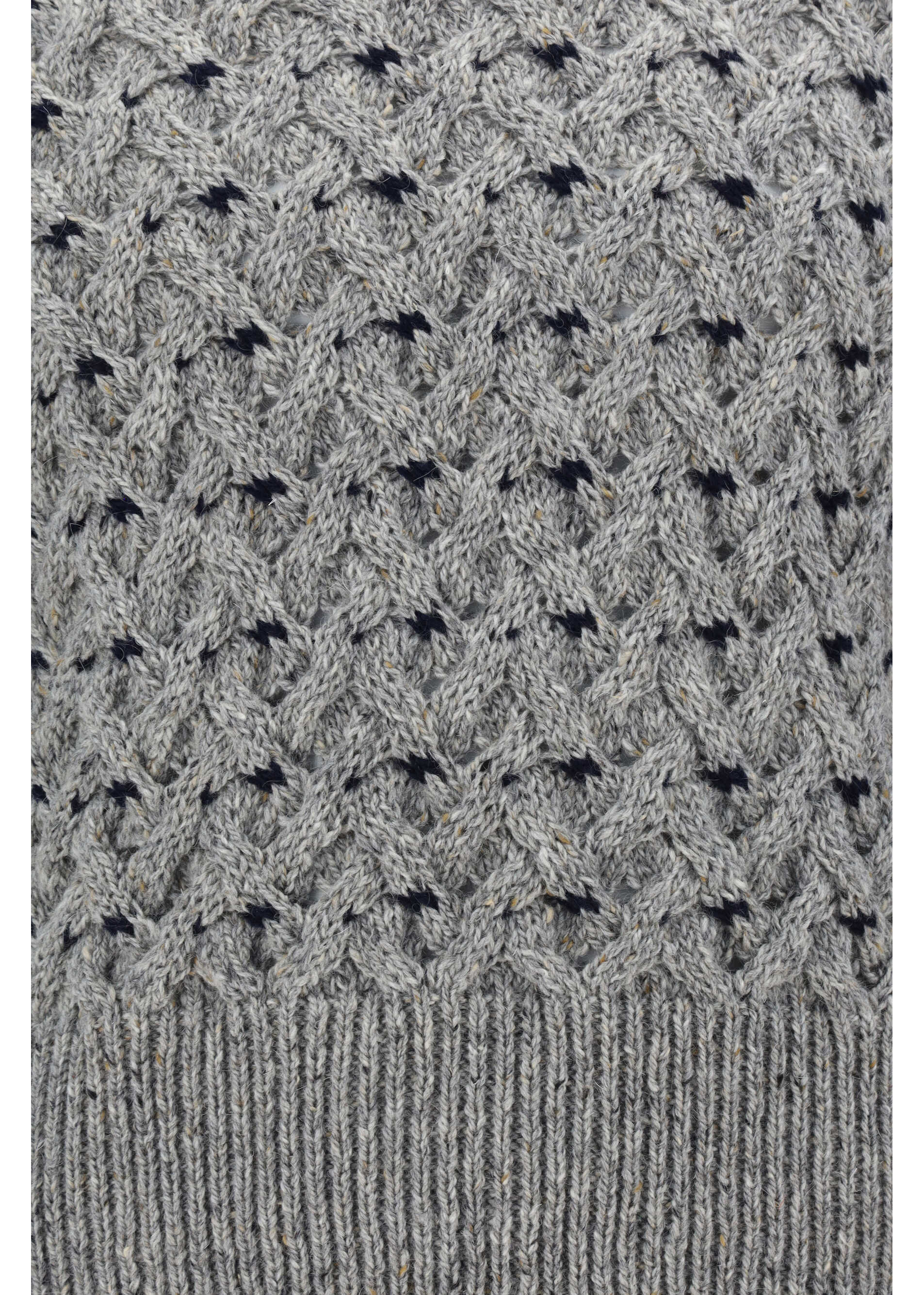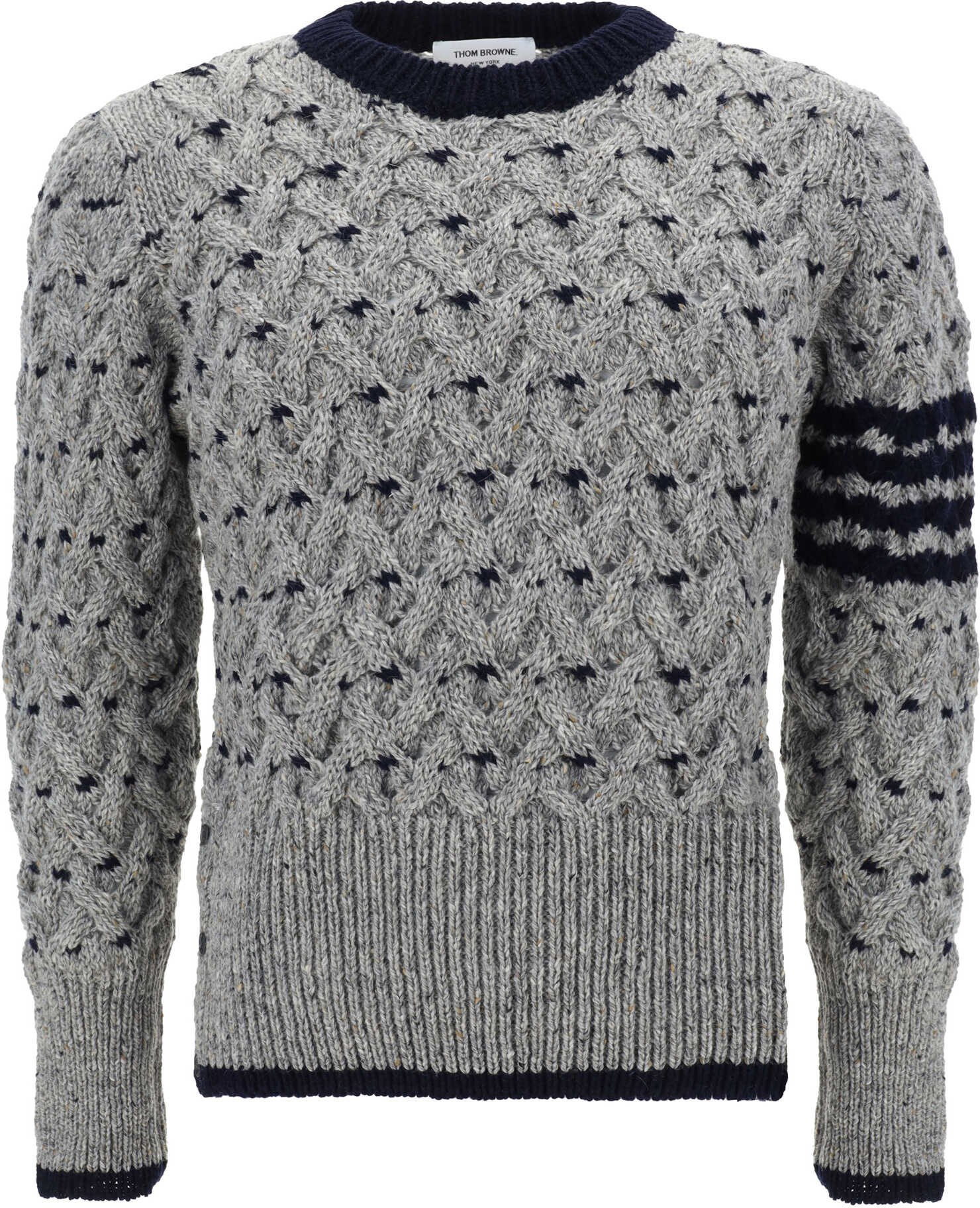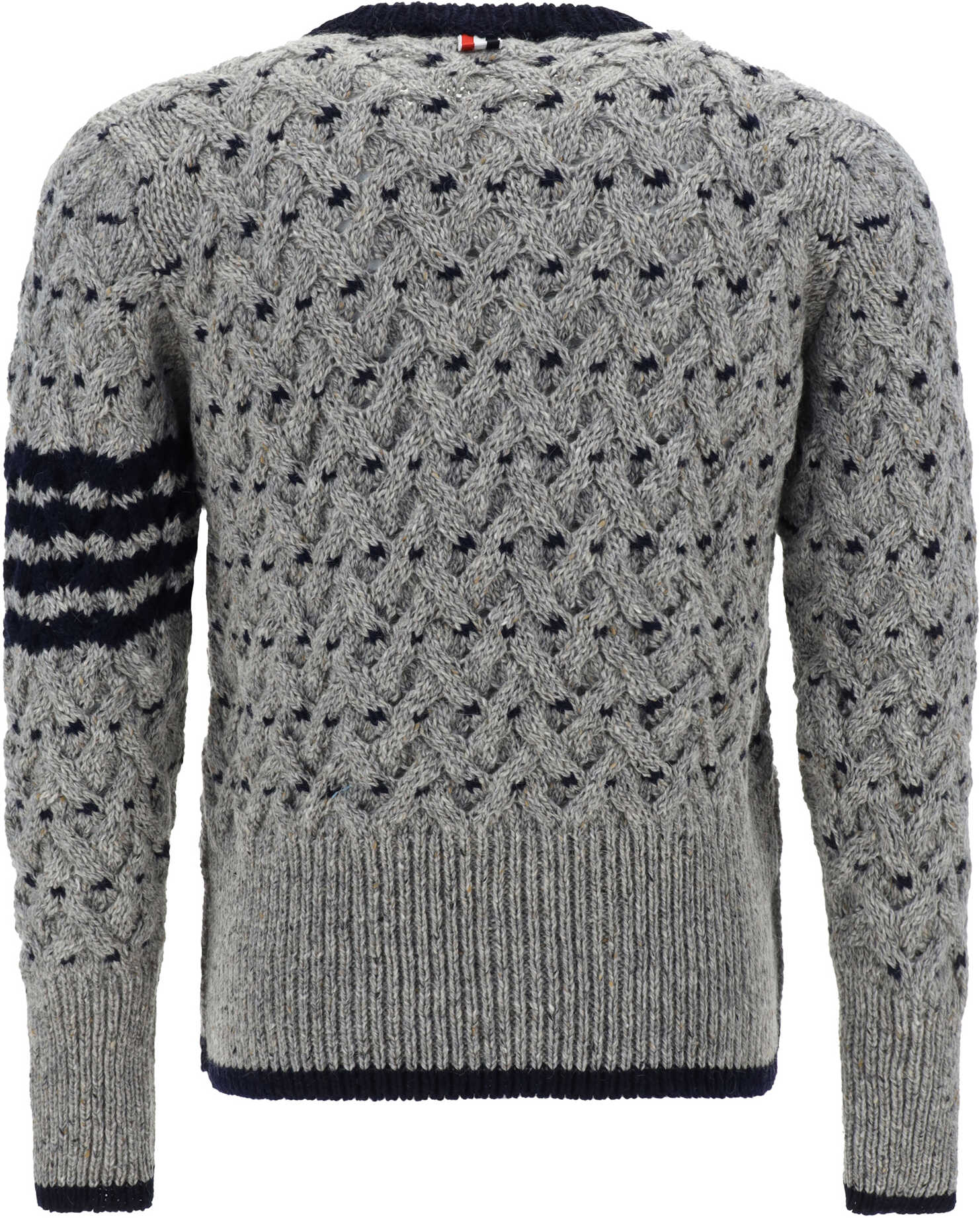 Wool Sweater by Thom Browne, all-over woven knit weave, ribbed cuffs, ribbed high hem, button-adjustable side slits, iconic slanted side bands on left arm, regular fit.