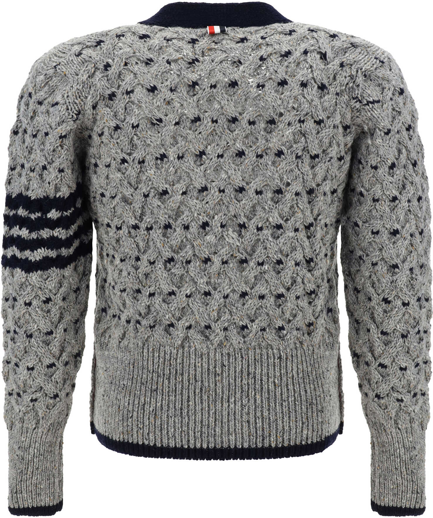 Wool Cardigan by Thom Browne, all-over woven knit weave, v-neck with ribbed trim, ribbed hem, ribbed cuffs, ribbed high hem, side slits adjustable by buttons, iconic slanted side bands on left arm, regular fit.