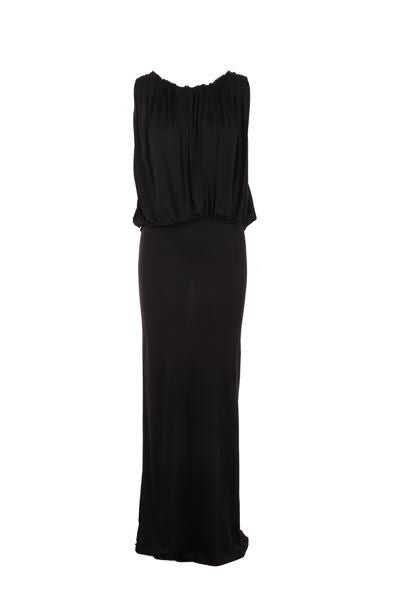 Saint Laurent's sleeveless long dress crafted in black shiny responsible jersey. Featuring band straps, front U-neckline and back wide V-neckline with curled edge. The design is completed by the pleated details. Unlined interior.