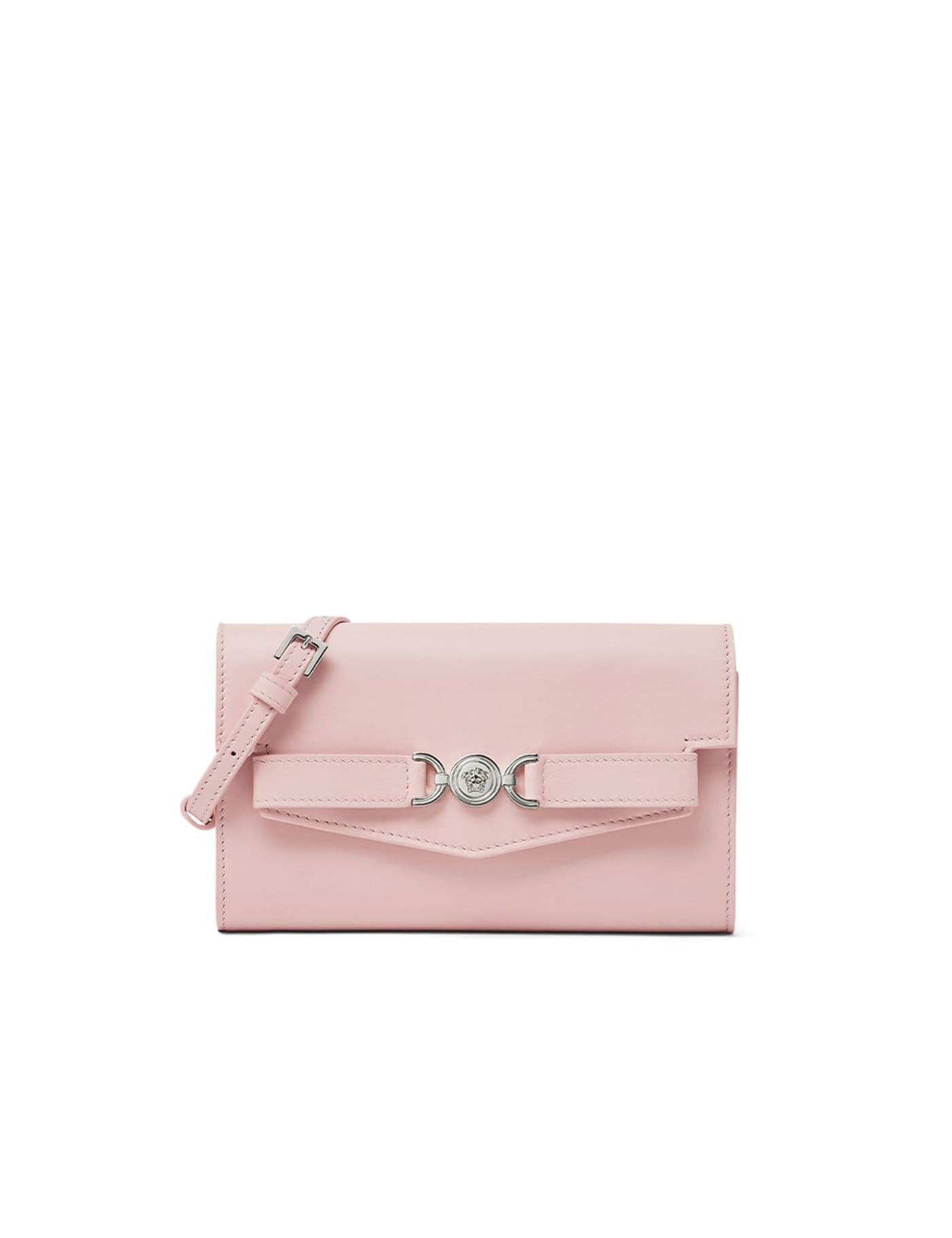 Light pink calf leather medusa plaque detail logo stamp to the rear adjustable detachable shoulder strap foldover top main compartment silver-tone hardware