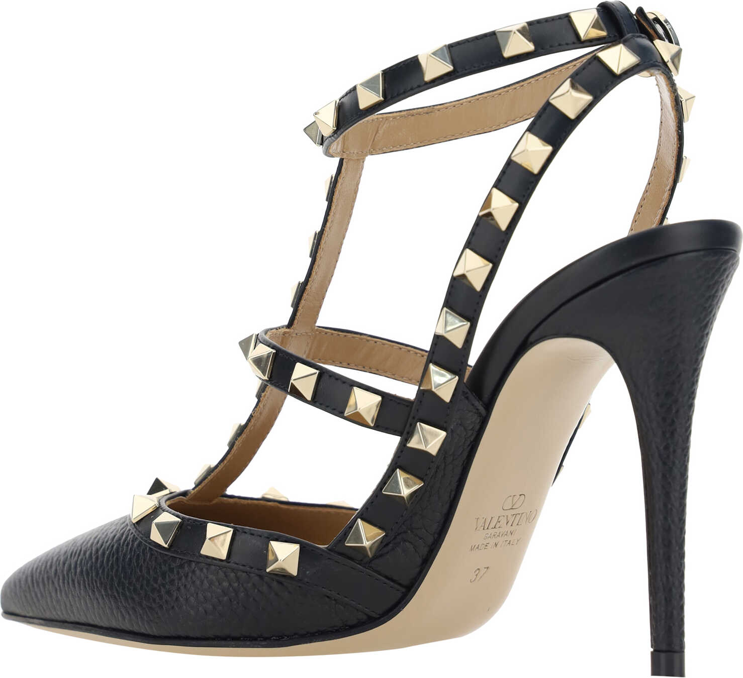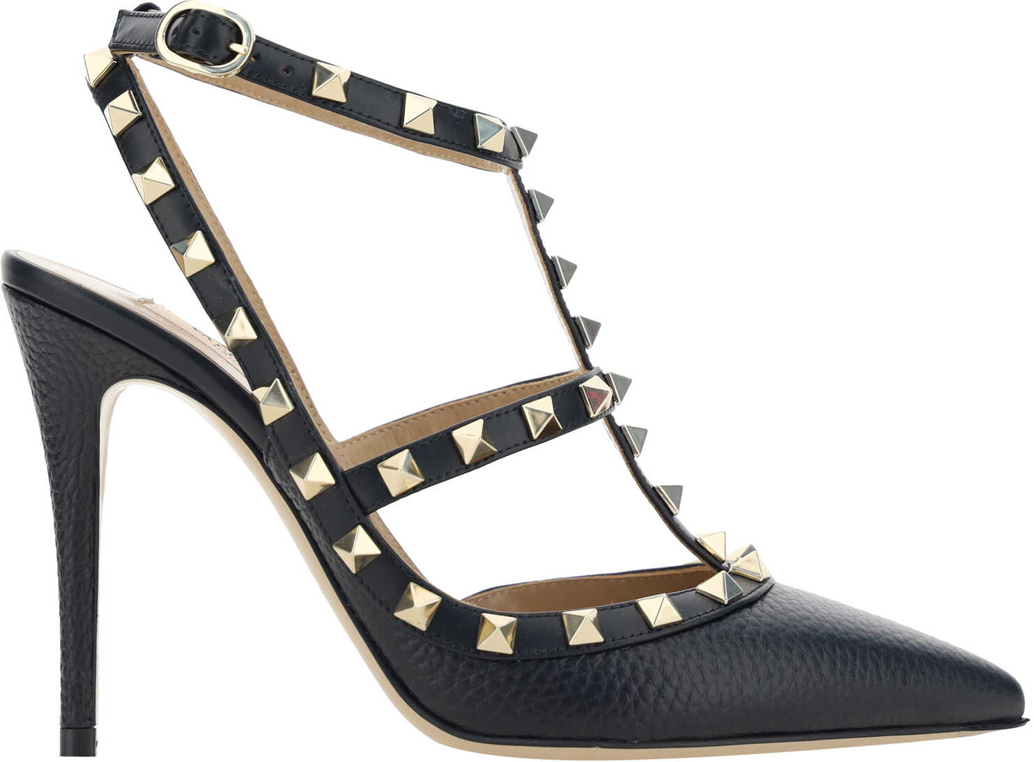 Calfskin Rockstud Pumps by Valentino Garavani, elongated geometric toe, adjustable ankle lap strap closure, matte leather design, leather stiletto heel, brand's iconic all-over applied studs, logoed insole.