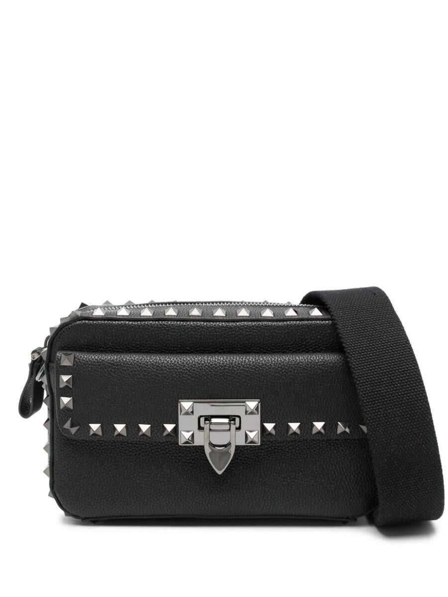 black leather grained texture signature Rockstud embellishment adjustable detachable shoulder strap front flap pocket rear patch pocket logo print to the rear main compartment internal card slots internal logo stamp full lining silver-tone hardware top zip fastening This piece comes complete with a protective dust bag.