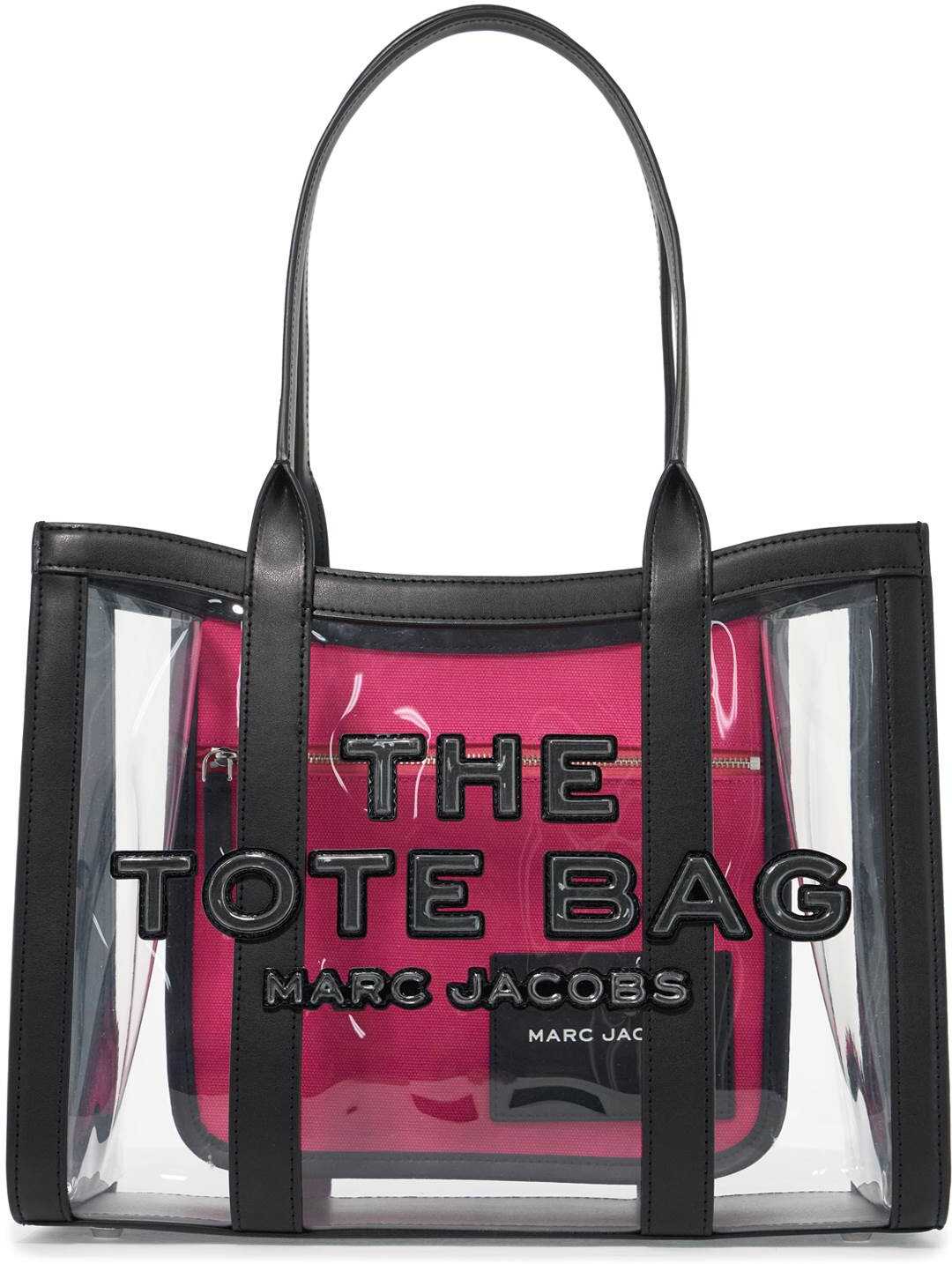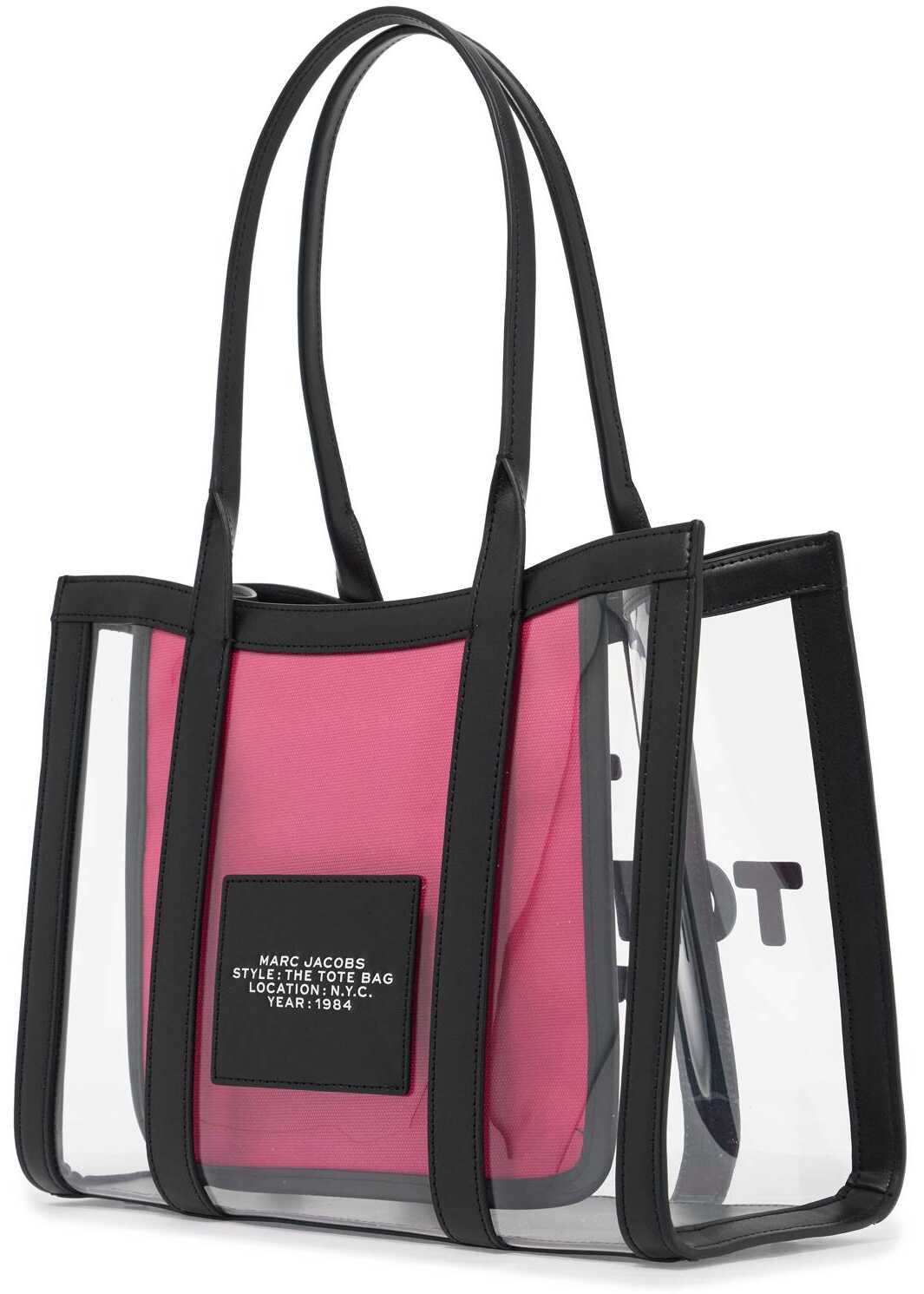 A reinterpretation of Marc Jacobs' iconic design, this medium tote is crafted in sturdy transparent PVC with elegant smooth black leather finishes and three-dimensional lettering on the front. The open top design reveals an interior pocket with a fuchsia canvas zip and a leather card holder pocket. The bag is completed by convenient metal feet at the base and the traditional leather tag on the back.