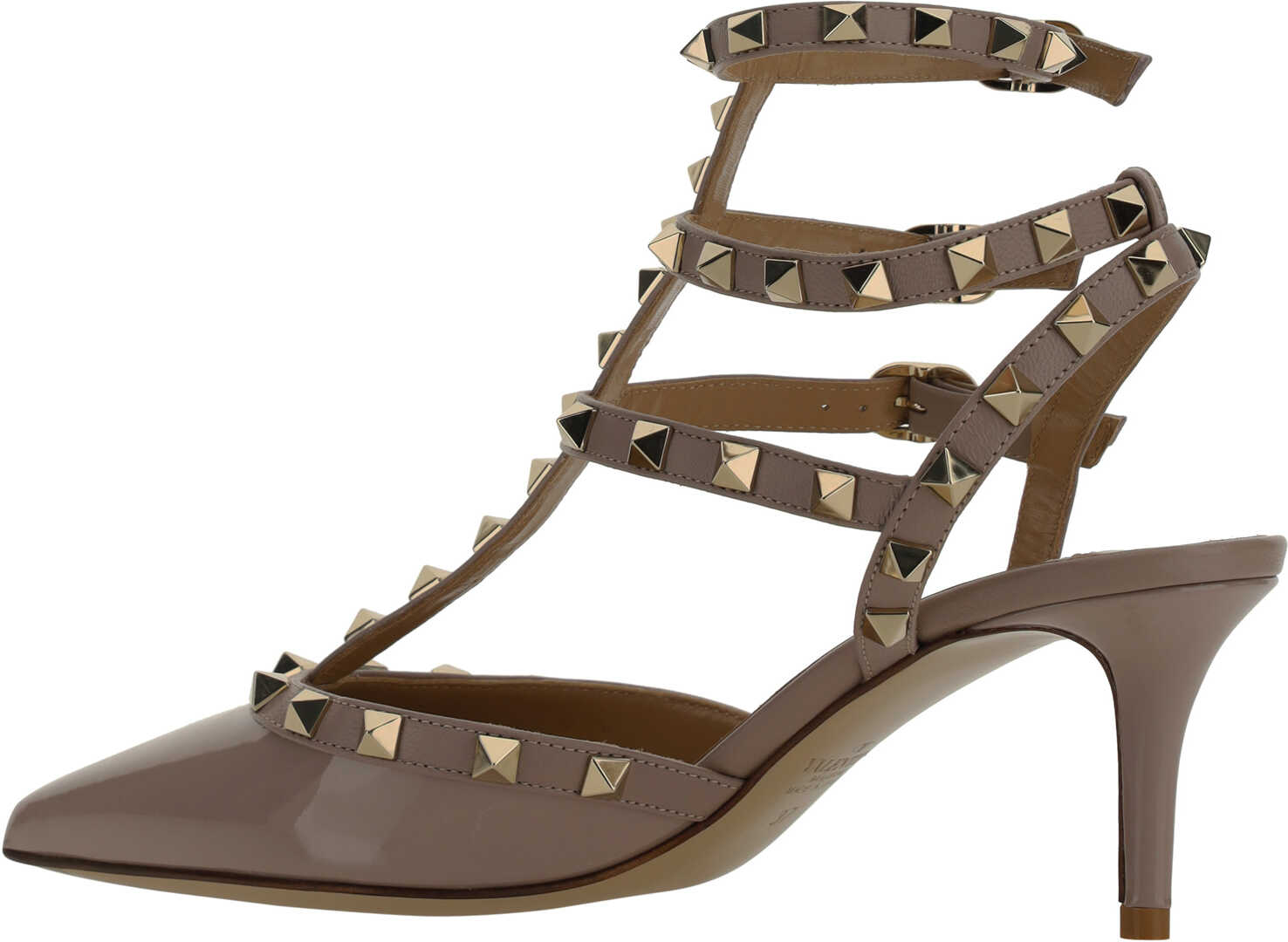 Calfskin Rockstud Pumps by Valentino Garavani, elongated geometric toe, adjustable ankle lap strap closure with triple side buckle, glossy leather design, leather stiletto heel, iconic all-over brand applied studs, logoed insole.