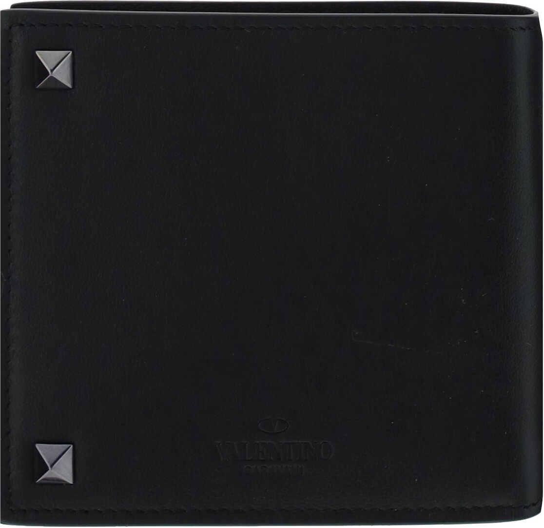 Calfskin Rockstud Wallet by Valentino Garavani, billfold model, billfold compartment, interior card slot, iconic Rockstud studs applied on front and back.