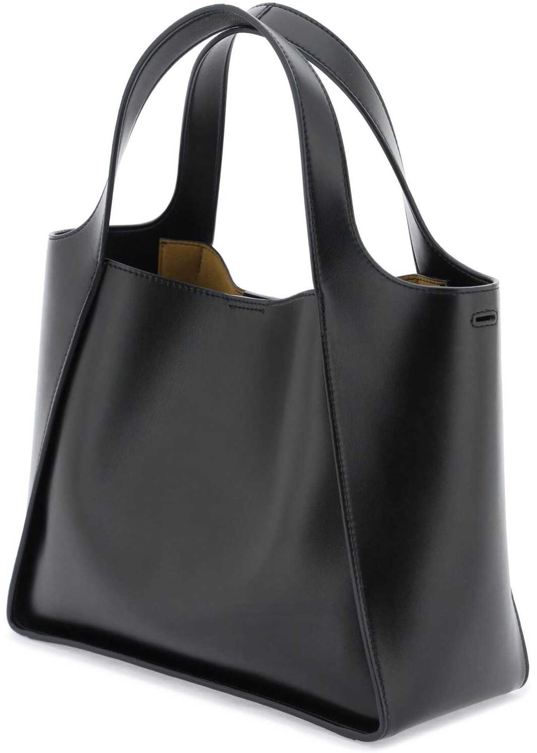 Stella McCartney tote bag crafted in faux leather with openworked Stella logo on front. Double top handle and adjustable and removable shoulder strap. Magnetic button closure, suede-effect interior featuring a detachable pouch with flap and press-stud. Gold-finished metalware.